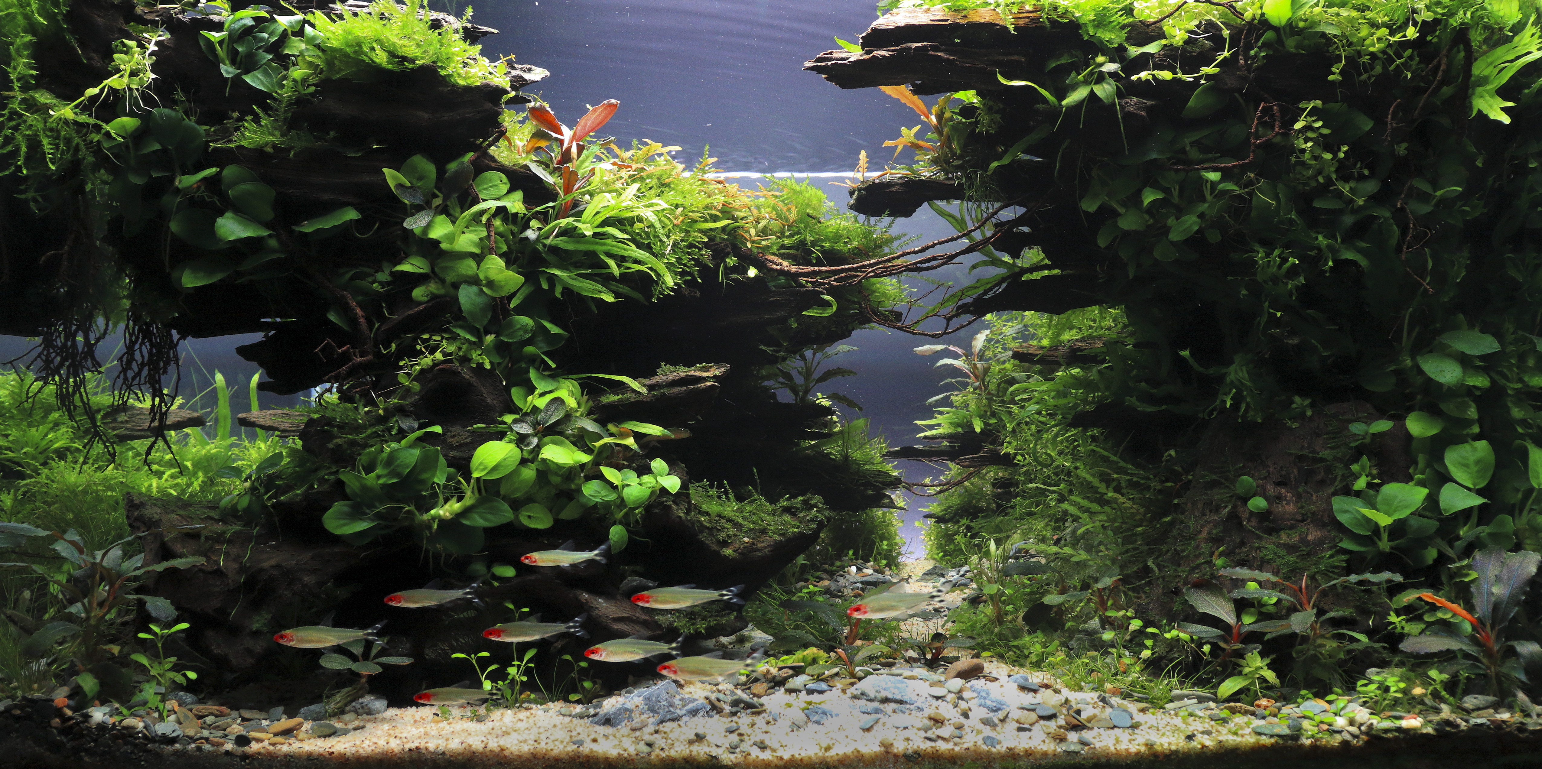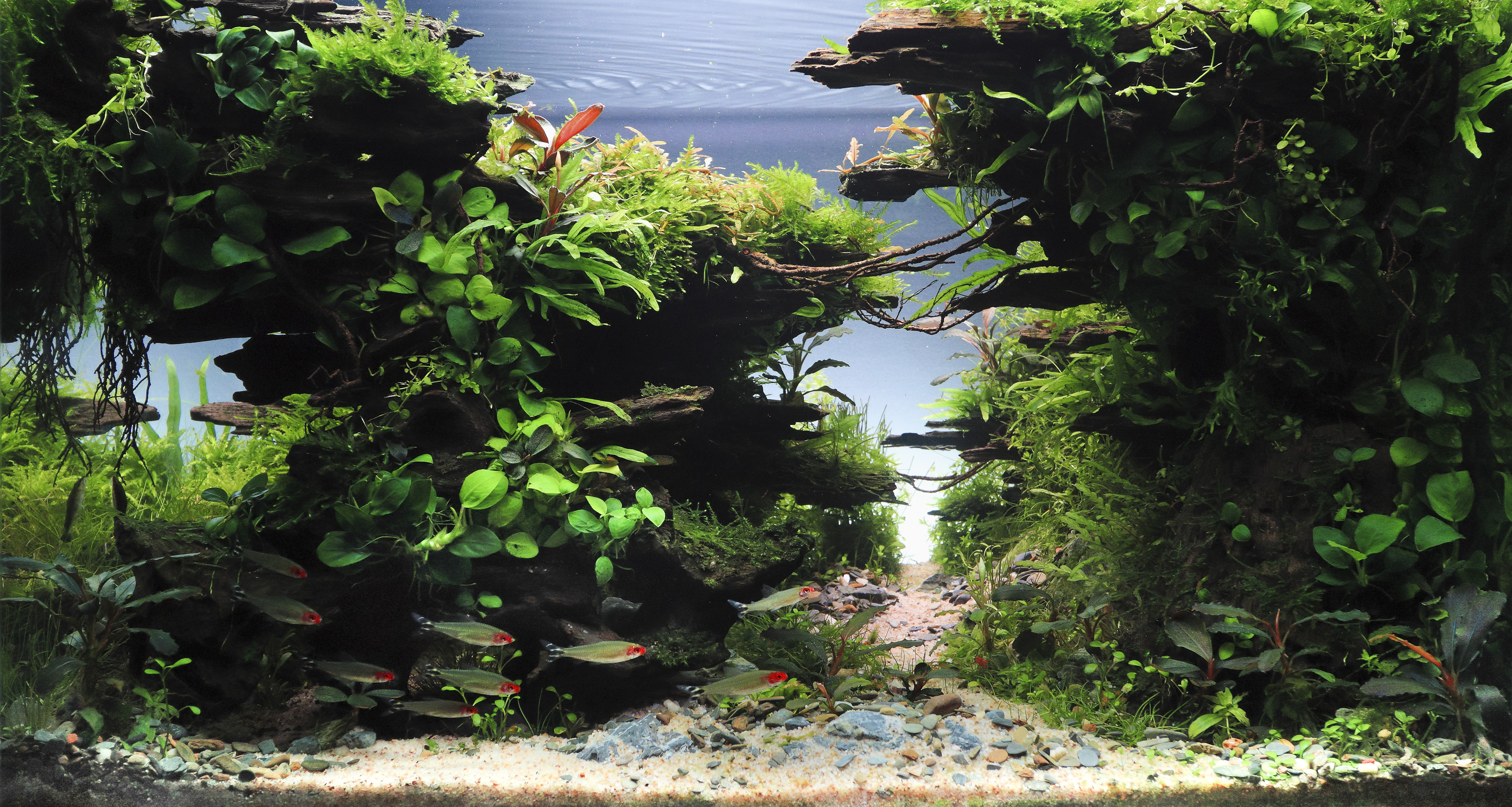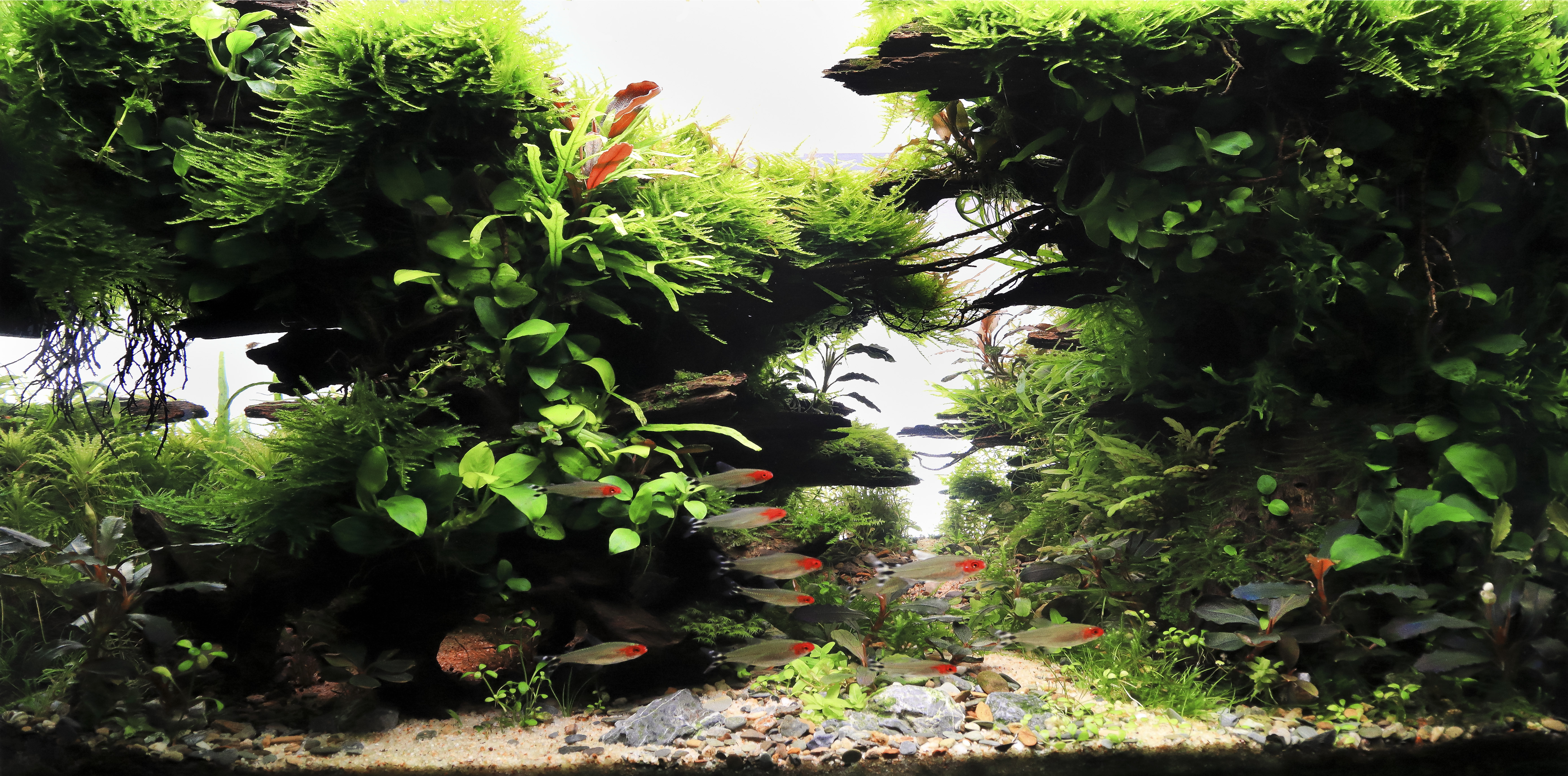 Inspired by Sebastião Salgado’s Poster Creek, this aquascape portrays the Amazon as a living organism where roots and shadows echo the forest’s silent rhythm. The central light path symbolizes breath, as if nature inhales through a broken canopy. Rummy Nose Tetras glide like tropical birds, infusing life and movement into the stillness.