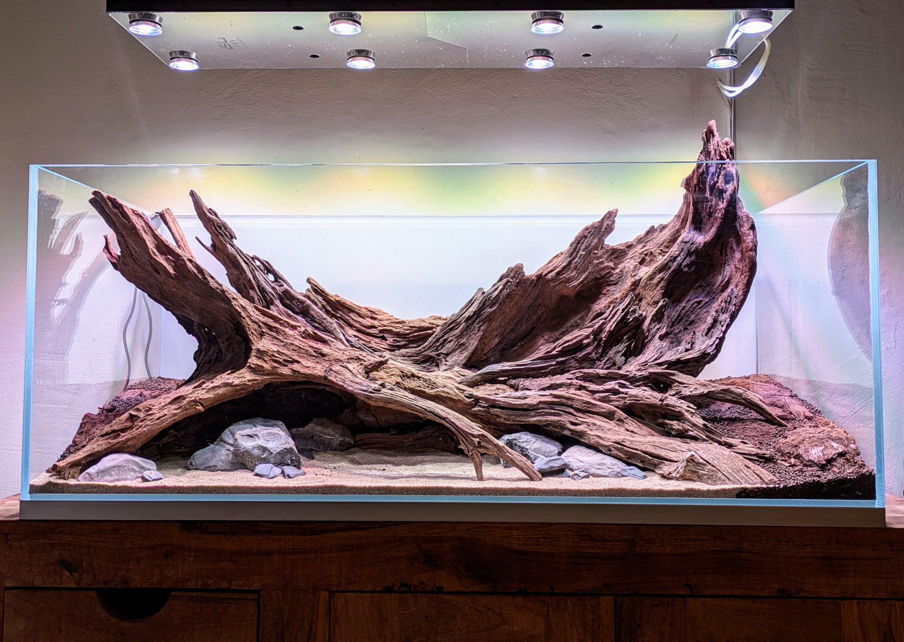 This is a tremendous layout, making for a uniquely beautiful paludarium. This layout redefines expectations of what one should expect when seeking to create such a display. The hardscape is bold and easily understood through its gestural composition, leading the eye up to its vanishing point, as intended. Formulaic in this regard, the creator provides a unique planting plan that helps to further convey the layout. Planting is especially well-executed on the left and right corners, with beautiful attention to detail paid in the submerged front corner transitions, providing a seamless drift underwater. A minor tannin tint is welcomed, giving a richness to the well-manicured submerged portion and a further emphasis on the naturality of this layout.' Fantastic work - a joy to view!