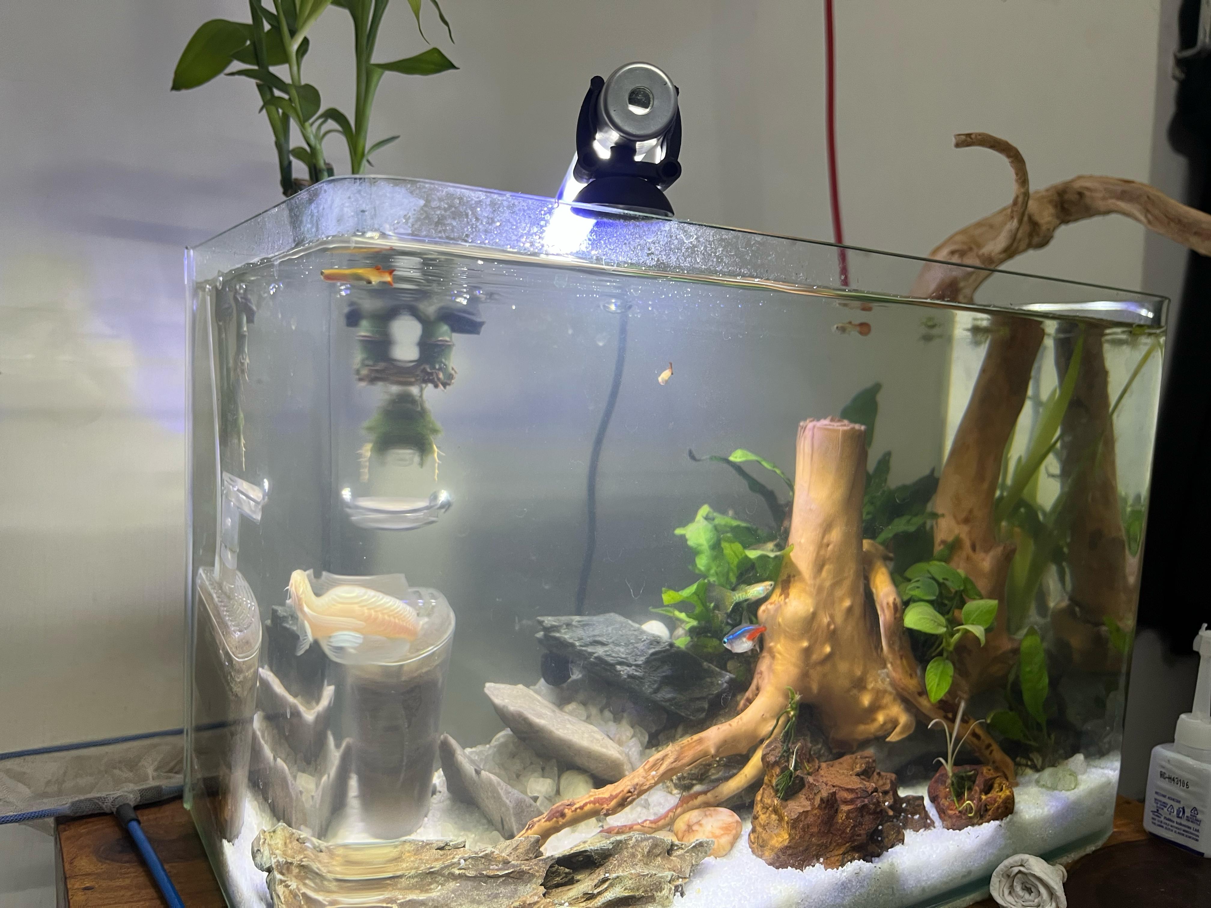 Aura blue Shrimp, cherry red shrimp, Amano Shrimp, Guppies, Neon Tetra, Corydoras, military head snail