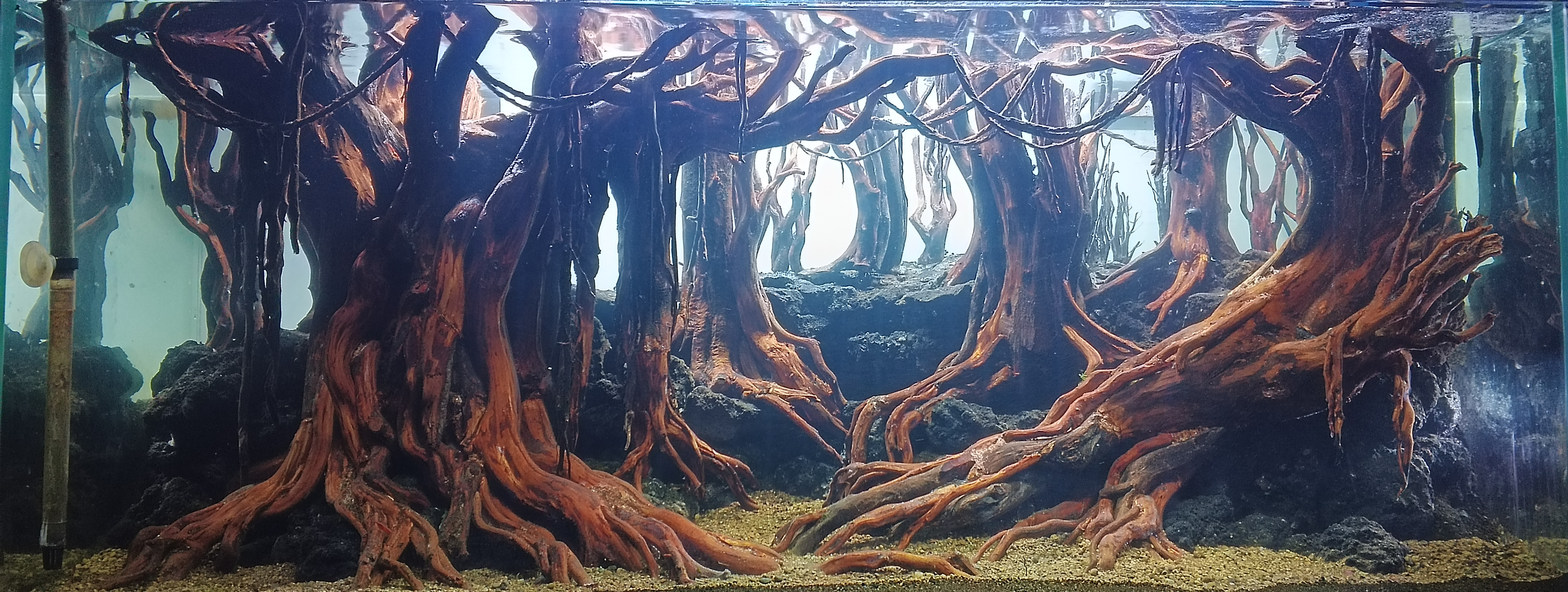 This aquascape is inspired by the dense and lively ecosystem of ancient forests. Root and wood structures are designed to form a natural canopy, creating a sense of depth and shade just like in a tropical forest. Plants such as moss, bucephalandra, hydrocotyle, and rotala thrive in various layers, representing the pristine balance of nature. Swarms of Red Nose add to the harmonious dynamics of life. Spring represents the return of life after a dormant period. When the forest is green, fresh and alive again.