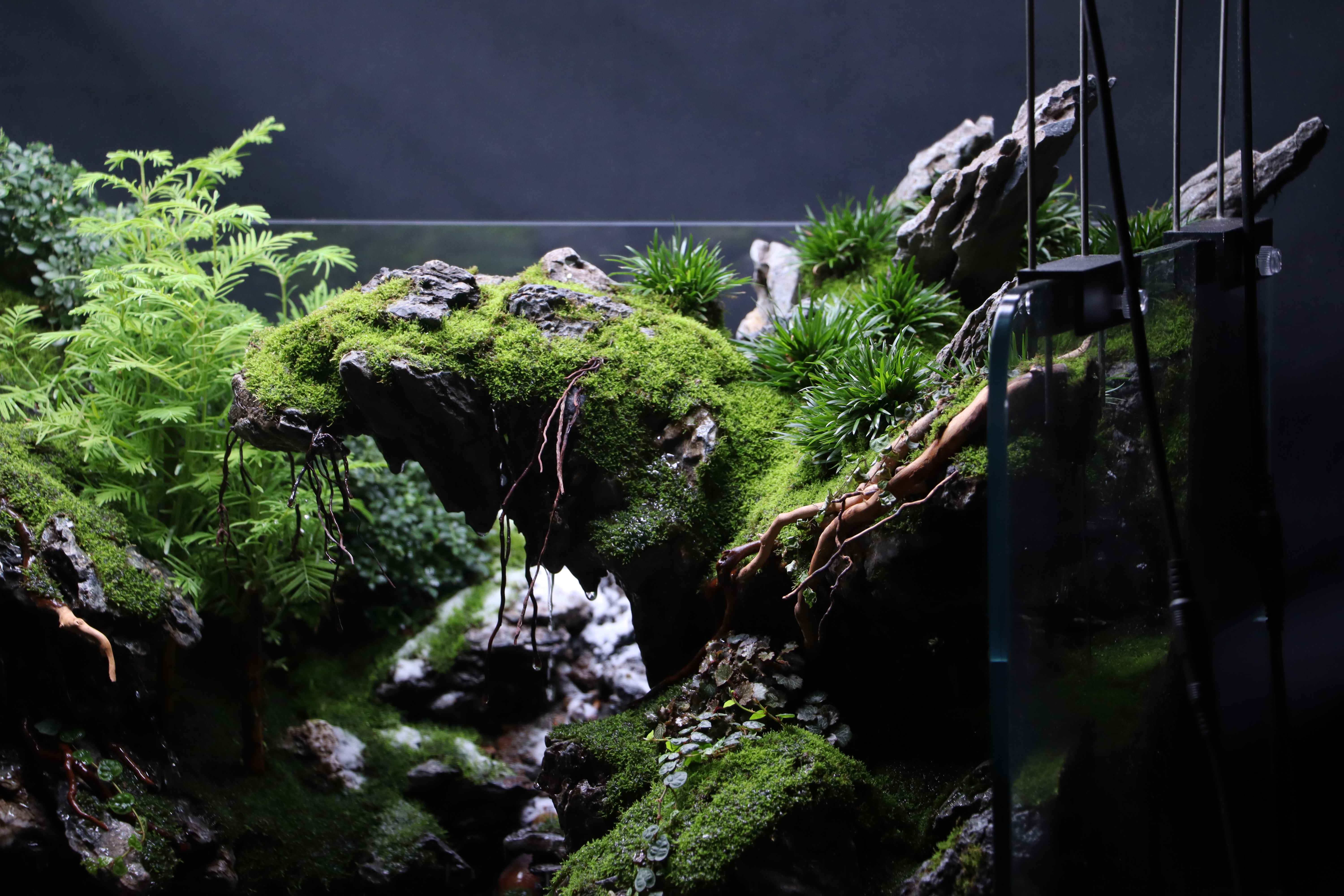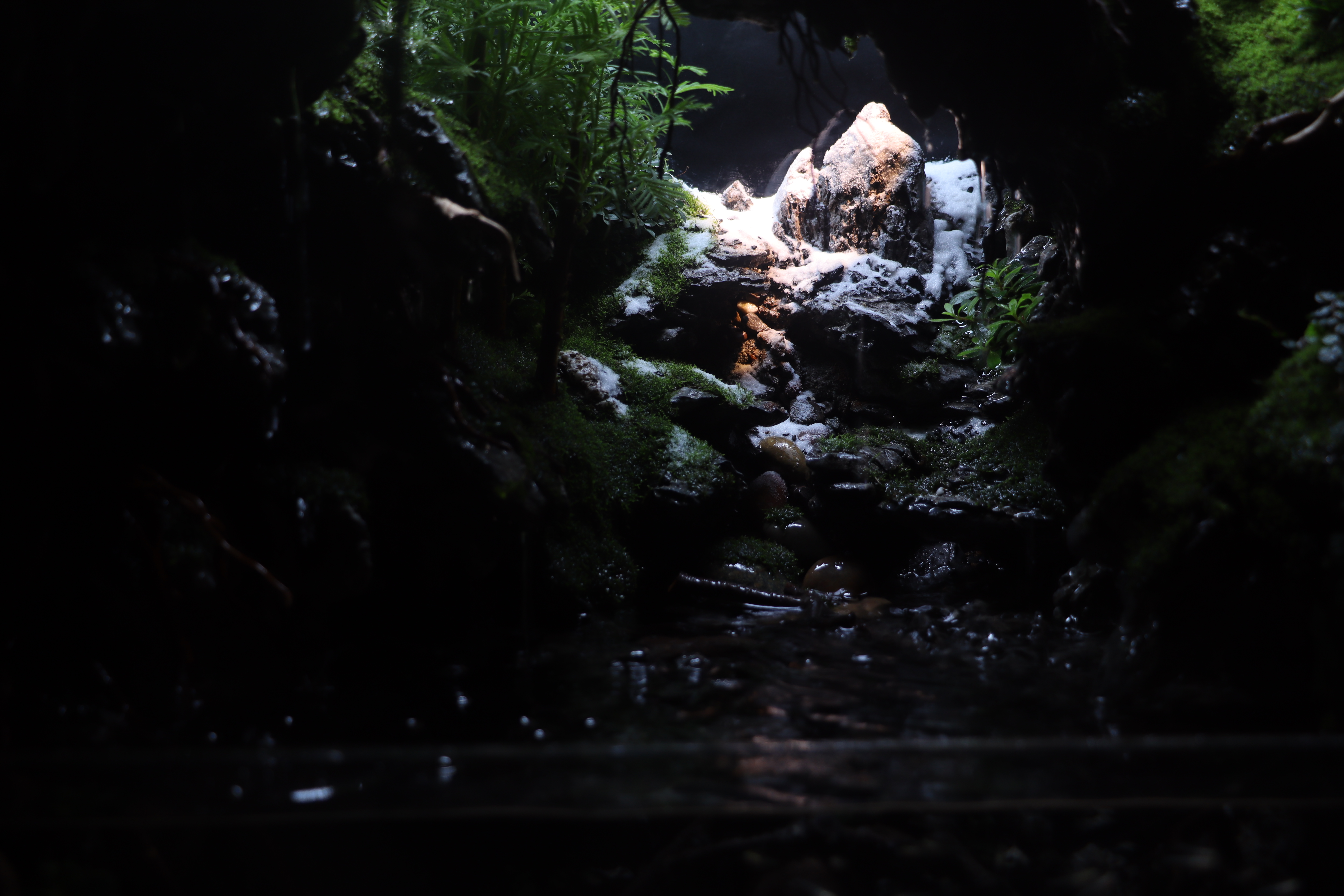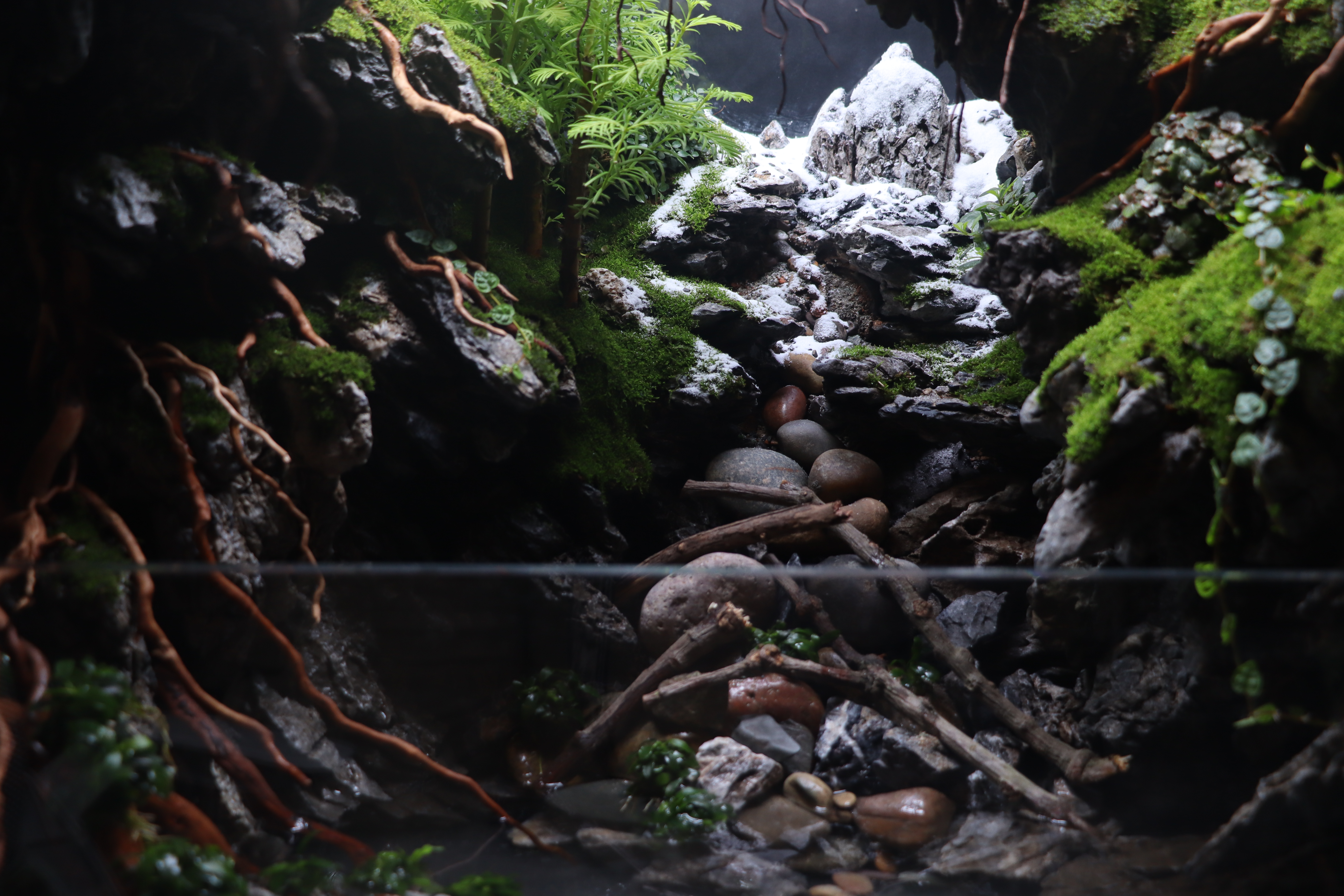 This is a tremendously impressive paludarium. The craftsmanship regarding hardscape composition is impressive. The creator makes that evidently clear. Thematically, the diorama composition is clearly understood. I do feel that there is stronger integration to the right side of the display, opposed to the left. That being said, the transition from above to below the surface is seamless and the creator demonstrates a great understanding of scale and perspective tricks. Plant health is wonderful, with an exciting variety of species that assists in furthering the theme presented. Wonderful work!