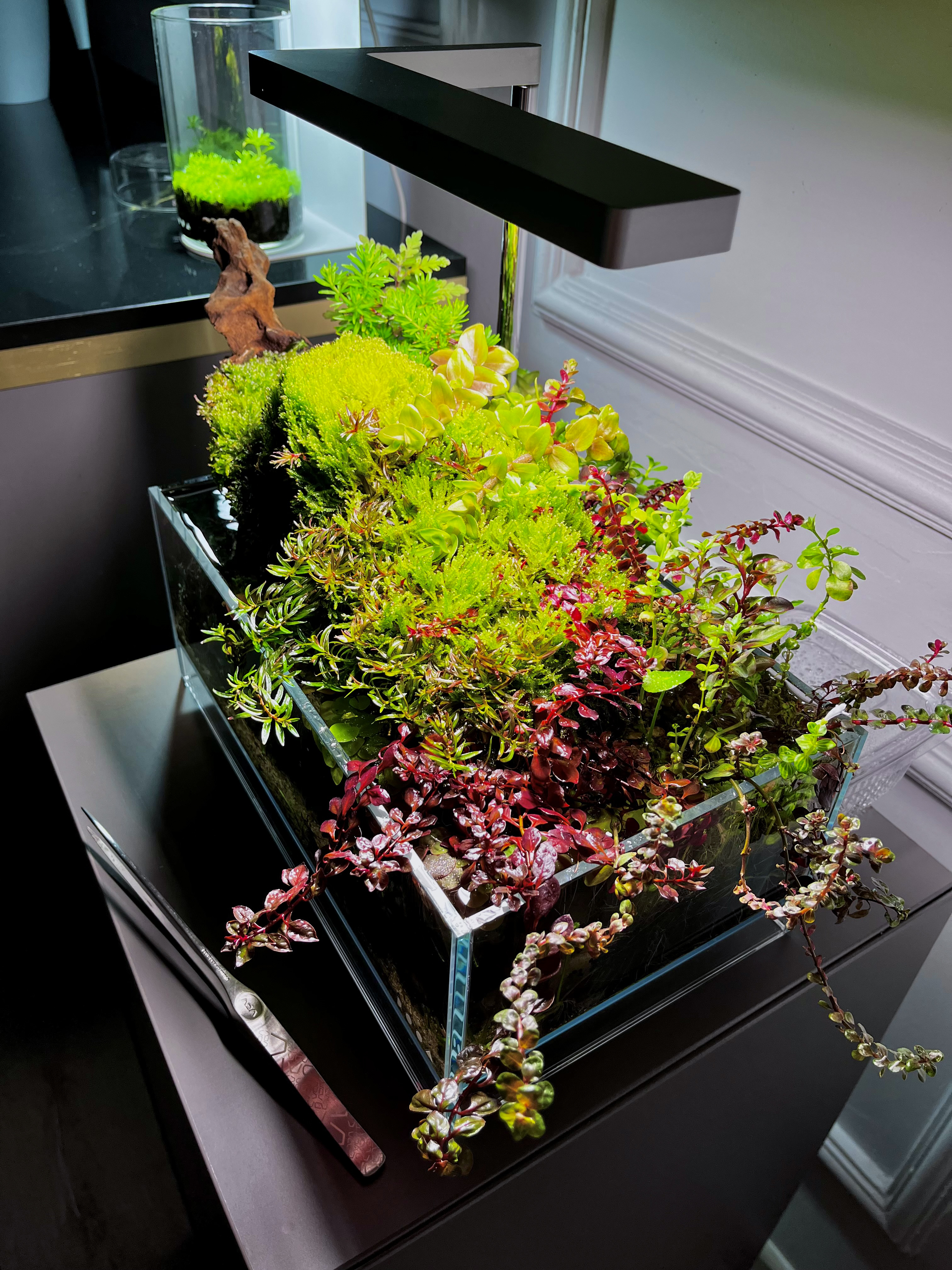 A very classic and vibrant riparium aquascape with good use of a variety of colors and textures. I enjoyed the use of the driftwood to provide nice directional flow in the aquascape. The Ludwigia provides a nice pop of color and it's growth outside of the aquarium is added touch that gives the ripariums an even more natural feel. Very well done!