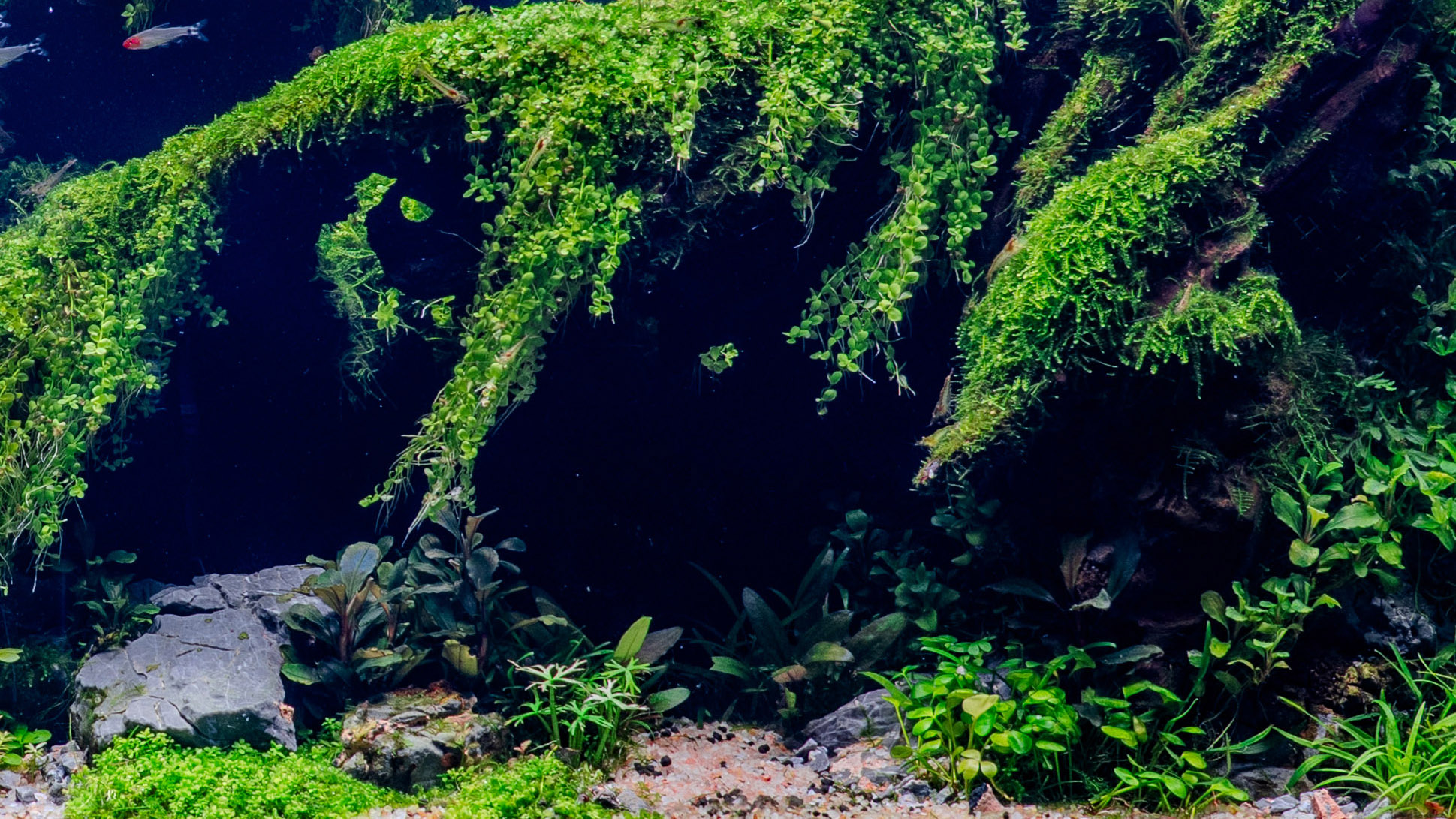 In this aquascape, I explore the hidden rhythm of nature—one not heard, but seen and felt in the silent choreography of light, water, and plant life. A massive piece of driftwood lies diagonally, like a fallen giant in the depths. From its branches, fine roots and aquatic plants hang downward, gently swaying with the unseen current. These flowing tendrils move not in chaos, but in a quiet, repeated pattern—like a musical phrase suspended in time. “Suspended Rhythm” speaks to the harmony between stillness and motion. The hanging roots mirror one another, creating visual echoes that draw the eye upward and inward, inviting a sense of calm and continuity. The repetition of these forms builds a visual tempo, a rhythm held in suspension, like notes of a melody waiting to be resolved. This layout is an ode to gravity, flow, and the quiet persistence of nature. It expresses how beauty can be found not only in what stands tall, but also in what gracefully descends—in the in-between space where life dangles, dances, and breathes.