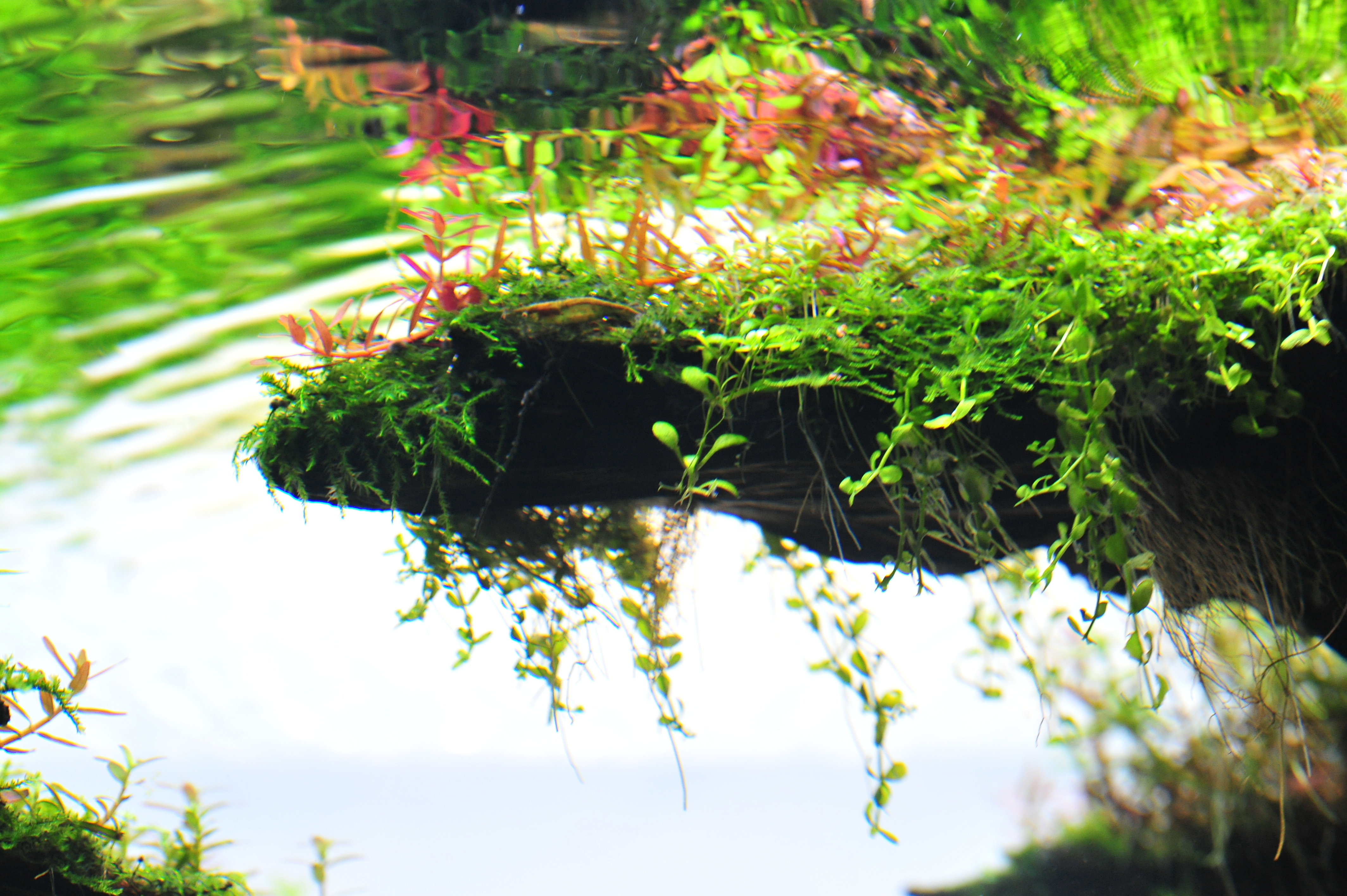 悬空仰视,下垂部分不用硬骨架来制作,而是利用植物的根部来进行表现,让一个水草缸里面的水草拥有了水上水下两种状态, 让景观不单具有水下的观赏性,水草水上的状态又是另外一番景象。中间孔洞暗部,犹如是一个通往另外一个世界的入口