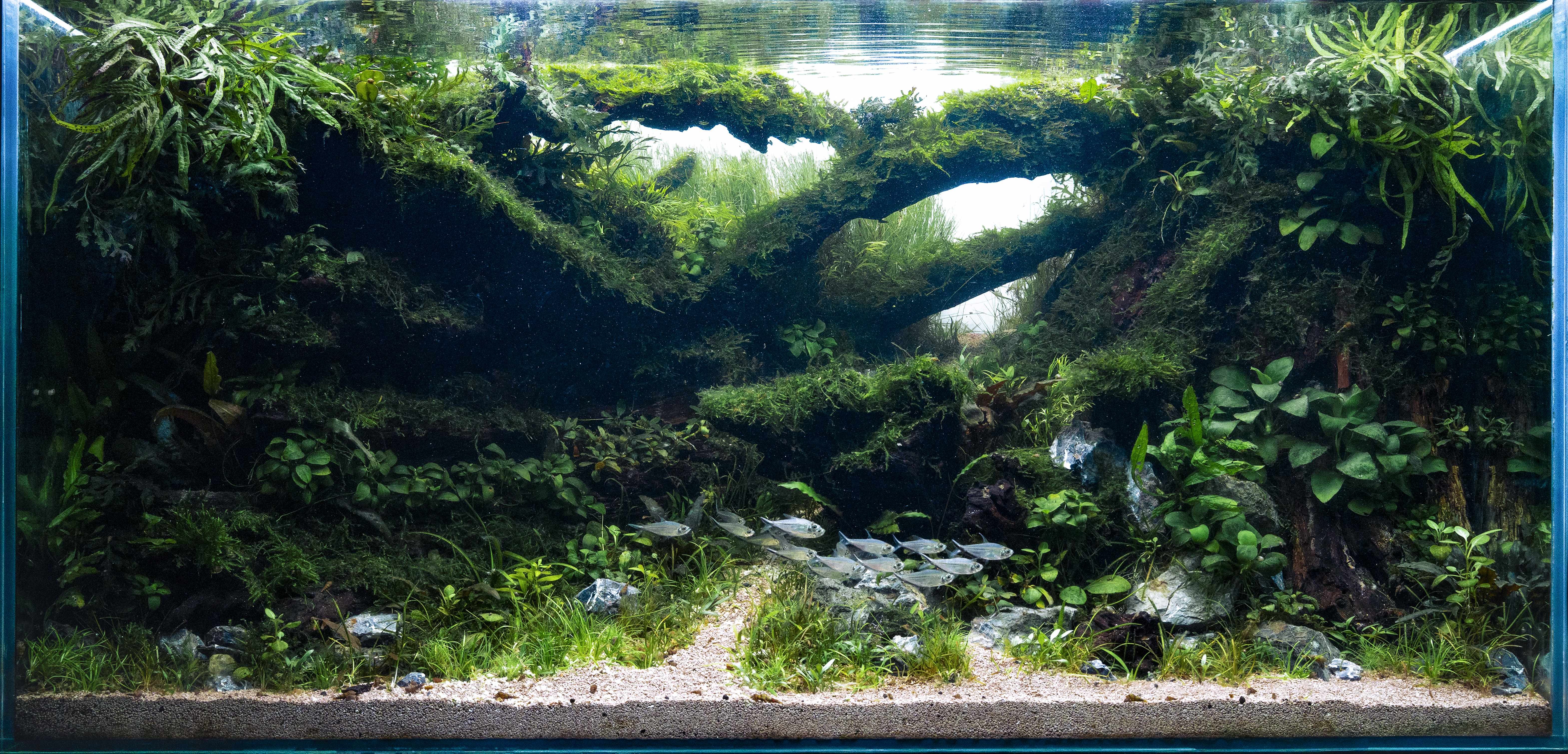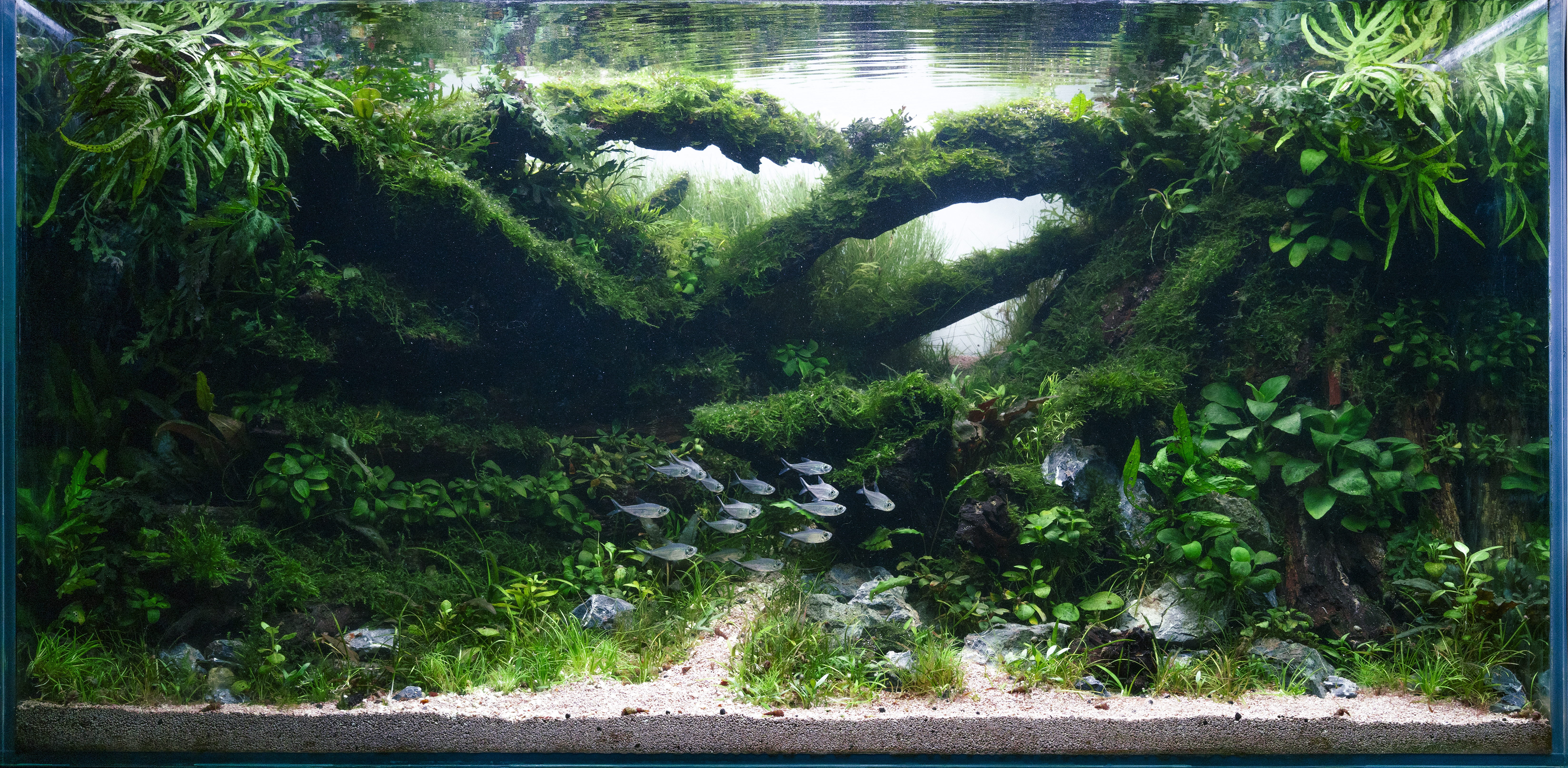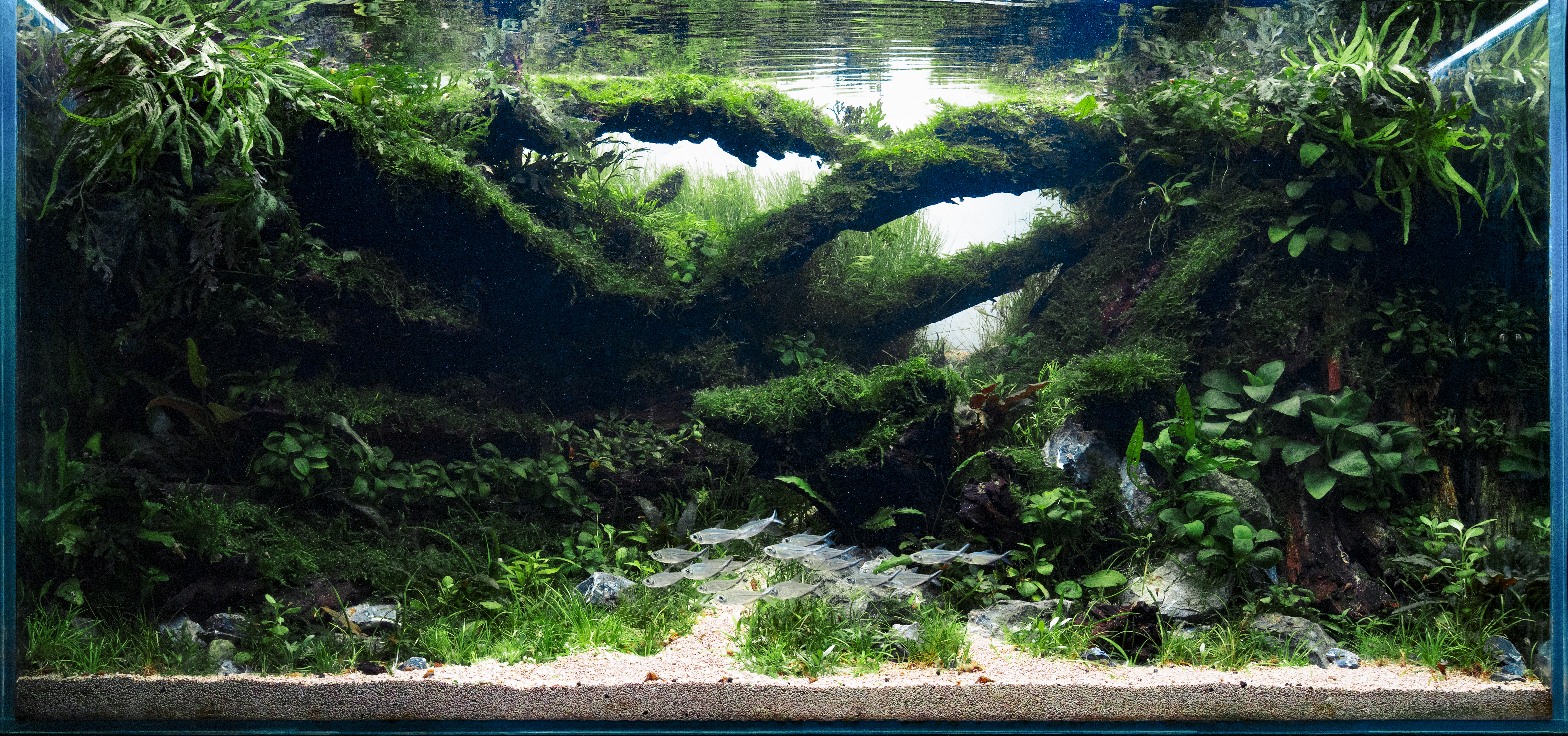 The Verdant Labyrinth is inspired by the mysterious beauty of overgrown forest ruins, where nature reclaims and reshapes the landscape over time. This aquascape captures the feeling of wandering through a lush, maze-like undergrowth, guided by light and texture. The intertwined driftwood and layered greenery were arranged to create depth and movement, while a central path draws the eye inward, evoking curiosity and wonder. My intention was to balance wild natural growth with a sense of hidden structure, creating a living scene that evolves with time, much like nature itself.