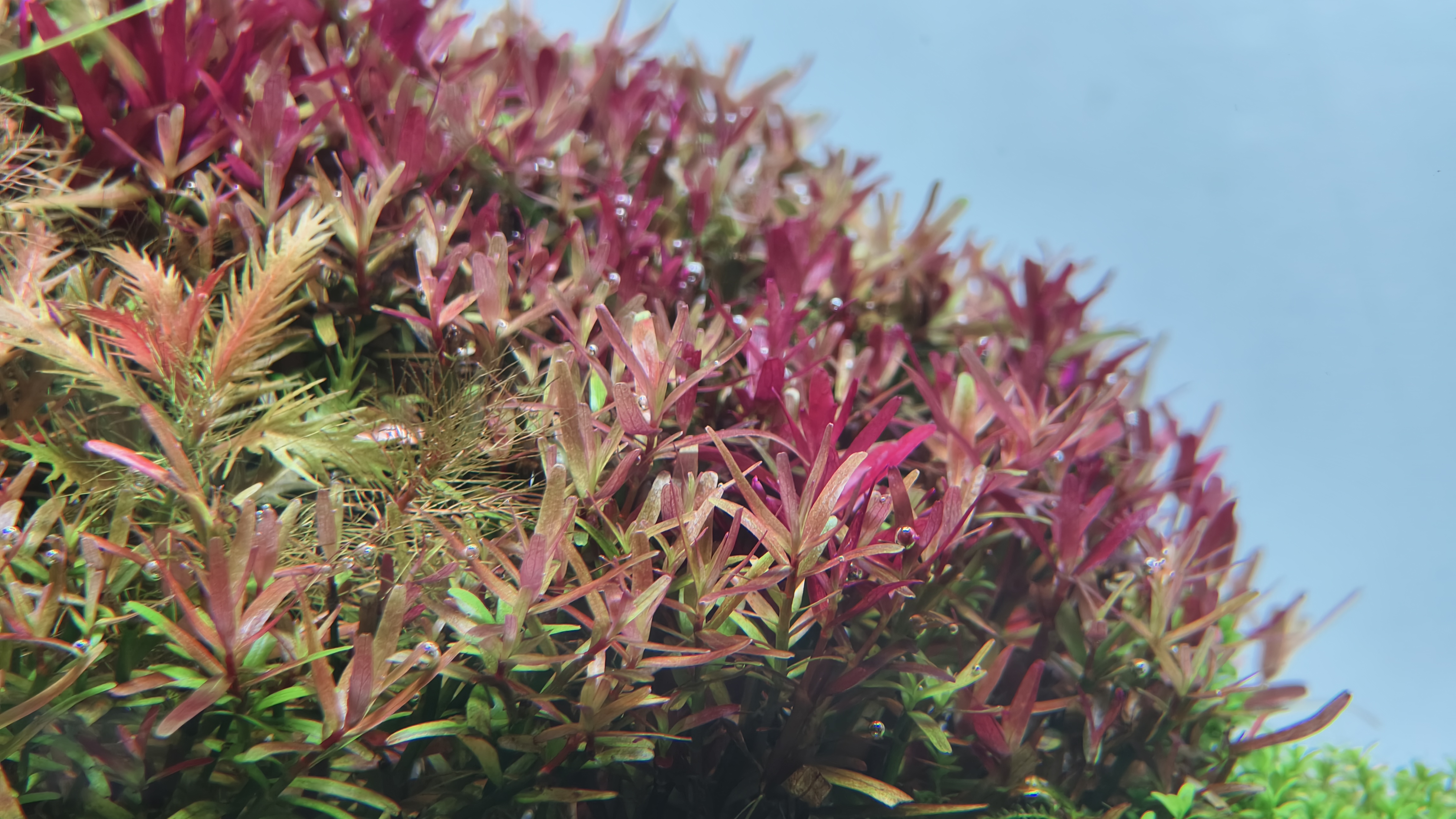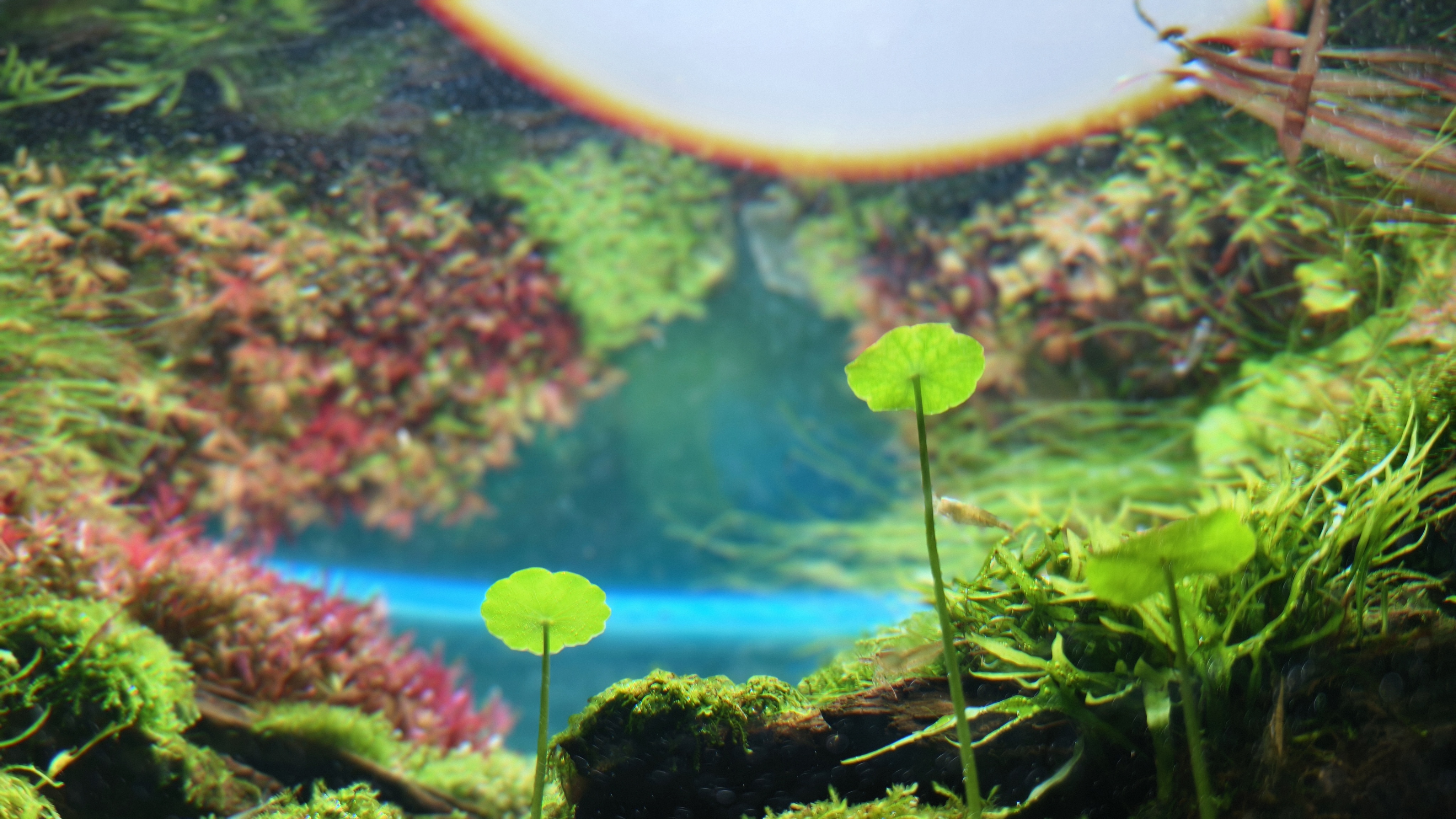 This aquascape adopts an upward-looking perspective from beneath the water, creating a fantastical experience as if the viewer were immersed underwater, gazing toward another world. In the distance, vibrant aquatic plants rise like a dreamlike forest, forming the visual focal point; in the foreground, clusters of Hydrocotyle float gently on the surface, softly reflecting daylight and ripples