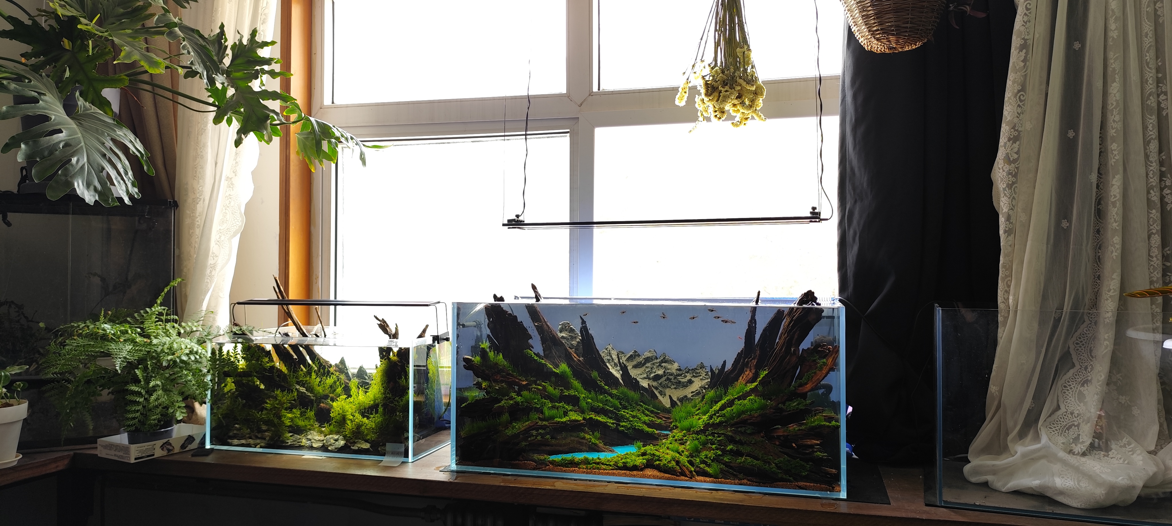火焰莫丝Flame Moss (Taxiphyllum sp. 'Flame')——模拟云杉林Spruce Forest。 珊瑚莫斯Coral Moss (Riccardia sp. 'Coral')——模拟草甸灌丛Alpine Meadow-Shrubland。