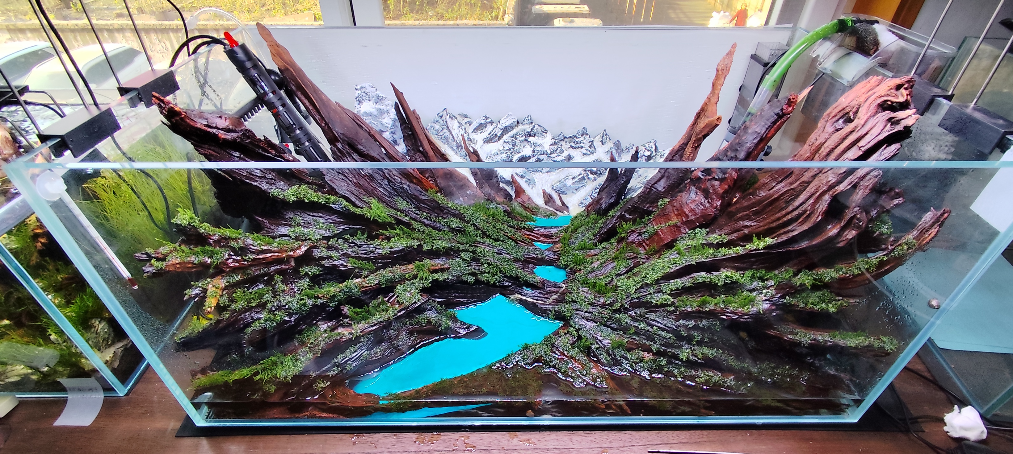 一、自然原型 《雪岭云杉》的灵感来自夏季新疆伊犁旅拍,印象最深的就是“冰蚀冰碛地貌景观丰富奇特,极为苍凉壮丽;山地垂直带谱规律明晰,且充满顽强生机。” 作品以冰蚀U型谷为主观景角度,涵盖多种地理要素:极远景是雪岭冰川及山腰云雾,中近景谷坡高处裸露的紫柚木是模拟风化岩石及高山地衣的棕色基底,谷坡中下部是高山草甸灌丛与针叶林,谷底则是连串的冰碛湖。 作为地理教师和野外生存爱好者的我,对“山地垂直带谱”和“冰蚀冰碛地貌”特有兴趣,便想以“水景➕地理模型”的还原手法,去尝试创作一个具备“地质史诗➕生态诗篇”气质的造景。 二、创新设计 1. 构图特点:交错掩映的山脊线用广角畸变进行夸张化,以增强代入感; 2. 素材运用:雪线之上采用青龙雪花石与丙烯凸显千年寒冰的厚重沉寂;雪线以下用紫柚木的天然肌理营造风化岩层的破碎沧桑,同时,紫柚木也特别贴合高原高山地衣的颜色和质感。 3. 水体固定:冰湖用UV胶固化彩砂,就避免了传统散铺化妆砂易脏污和散落的麻烦。 4. 植物运用:用火焰莫丝模拟天山特有针叶树种“雪岭云杉”最为神似。 三、借物咏志 冰川——裹挟着石块下滑,雕刻出凌厉角峰和宏大U谷,却又在谷底融退,留下碎石和雪水,积成一串翠珠般的冰湖,若将冰川比作男儿,定是铁汉柔情。 针叶林——穿透寒岩,傲然挺立,既有触摸云端的理想,又有扎根大地的顽强,大丈夫当如是! 时空维度——与冰川雕刻山峦的时空维度相比,人的一生不过是转瞬,是星尘。我们该如何度过这一生?云杉选择抓住这转瞬的阳光,奋力向上。 雪线之上是神灵般的自然永恒,雪线之下是苦寒中的绿意生机。敬畏自然,但又不惧苦难,才是对生命最动人的注解。 ——《雪岭云杉》