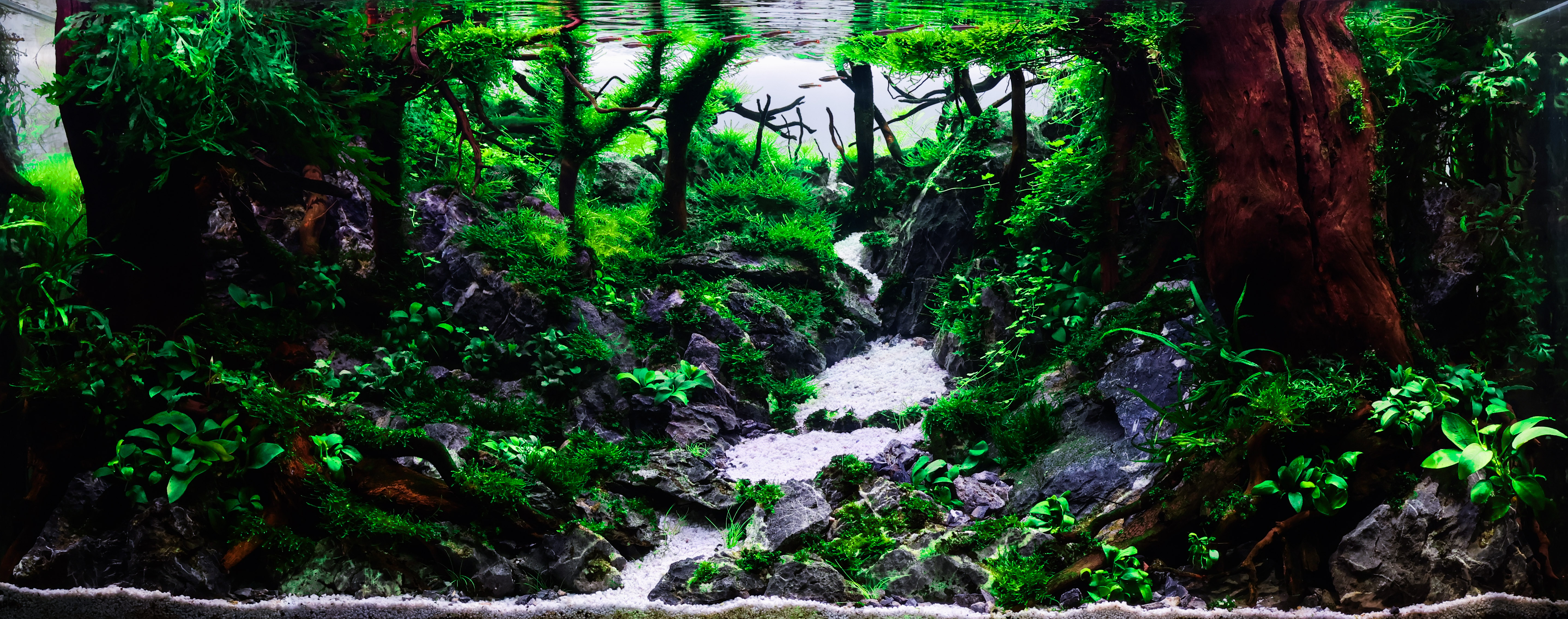1. Concept This work was inspired by the Kikuchi Valley in Kumamoto Prefecture, Japan. It seeks to recreate the untouched purity of nature—the crystal-clear streams meandering through deep forests, moss-covered rocks wrapped in moisture, and the stillness of early morning mist. The layout captures the spiritual essence of a landscape where human presence fades and only nature’s breath remains. 2. Design Elements The bright substrate flowing through the center represents the pristine watercourse of Kikuchi Valley. On both sides, driftwood and stones draped with moss and epiphytic plants express the humid atmosphere and quiet vitality of the valley. In the background, the vertically trimmed aquatic plants evoke the towering forest canopy, enhancing depth and immersion. The overall composition was designed to resemble the entrance to a forest path, inviting viewers into the heart of a serene woodland. 3. Technical Intent Every element—wood angles, moss placement, plant density and scale, and the flow of substrate—was arranged to reflect the authentic structure of Kikuchi Valley. Light intensity and CO₂ levels were carefully balanced to support the harmonious growth of mosses and shade-tolerant species. Rather than depicting a season, this layout captures a still moment submerged in time, frozen beneath the water's surface. 4. Philosophical Message A forest untouched by human hands restores the inner silence we often forget. Kikuchi Valley embodies that sanctuary. This aquascape is a miniature world holding a single, tranquil moment—a visual echo of nature’s quiet voice.
