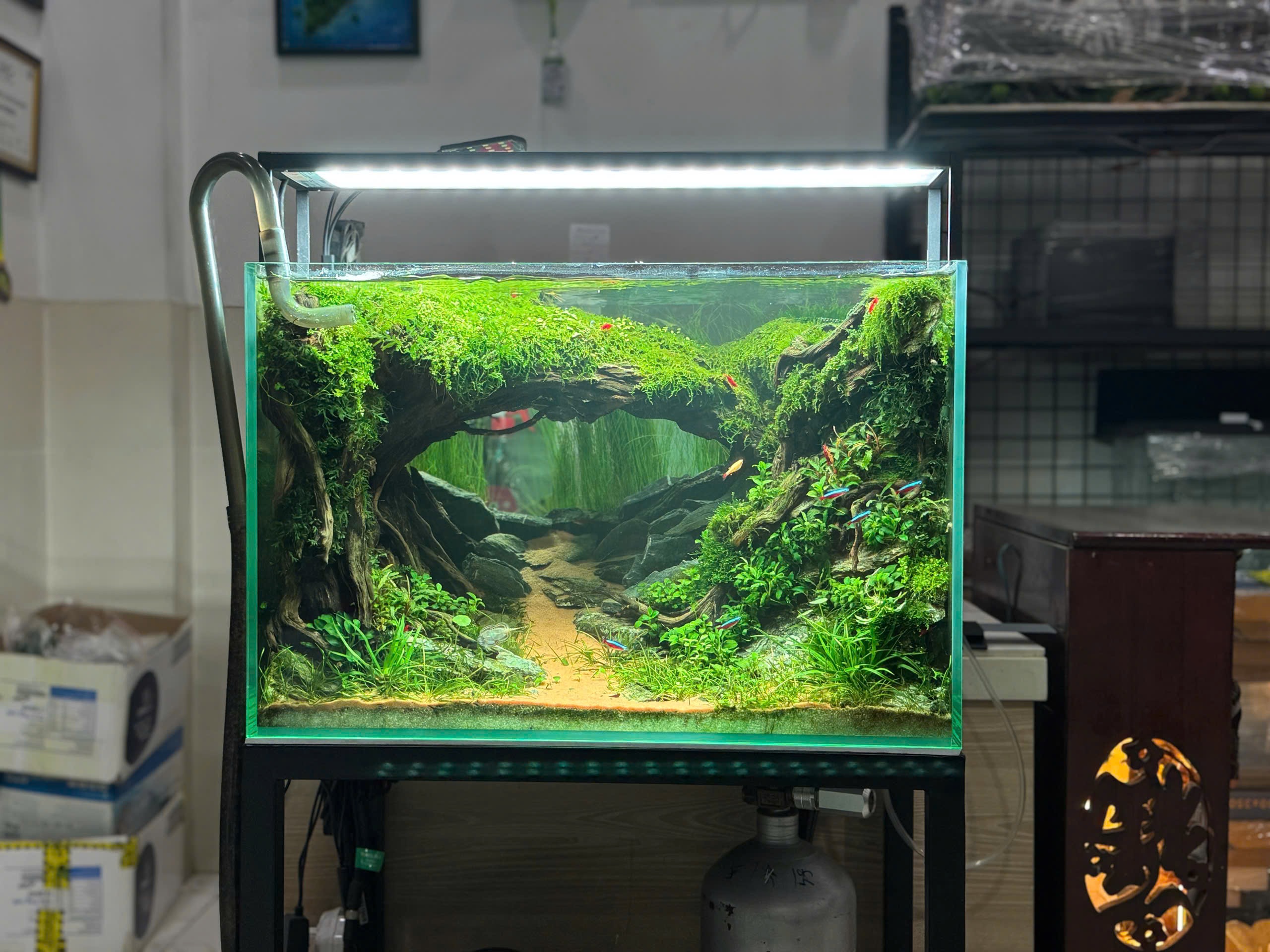 Renewal – A vision of rebirth and serenity. This aquascape captures the spirit of nature’s eternal cycle, where stone and driftwood intertwine to form pathways of time, and lush greenery rises to embrace the light once more. Each detail symbolizes a fresh beginning — calm waters, vibrant life, and the quiet strength of renewal.