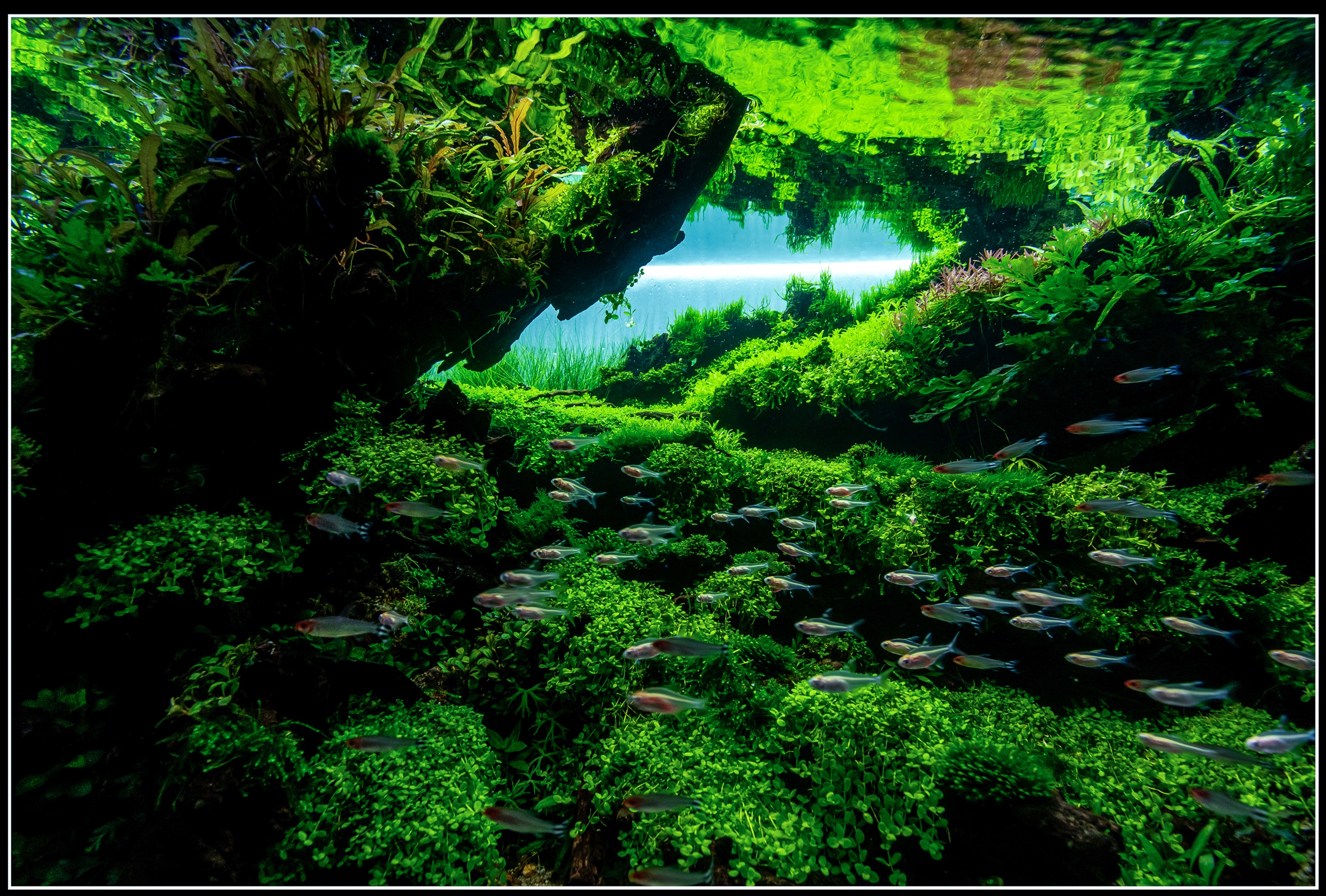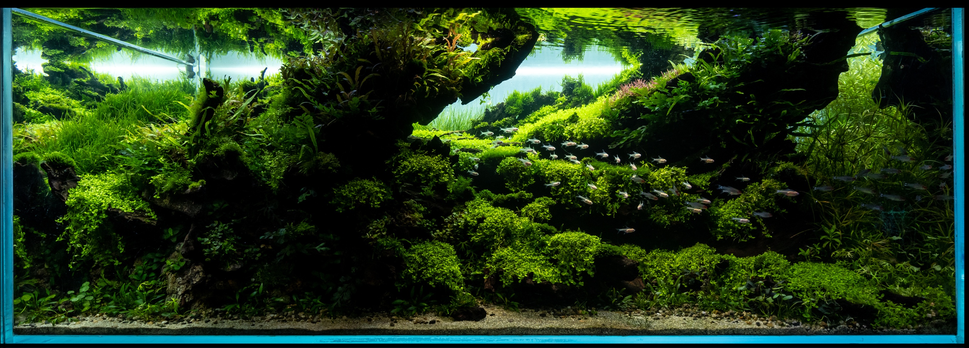 The aquatic plants are arranged lushly, with details that are well-thought-out yet orderly, giving a dazzling yet well-organized impression. The only slight drawback is whether it would be better if a little more of the driftwood texture were exposed?