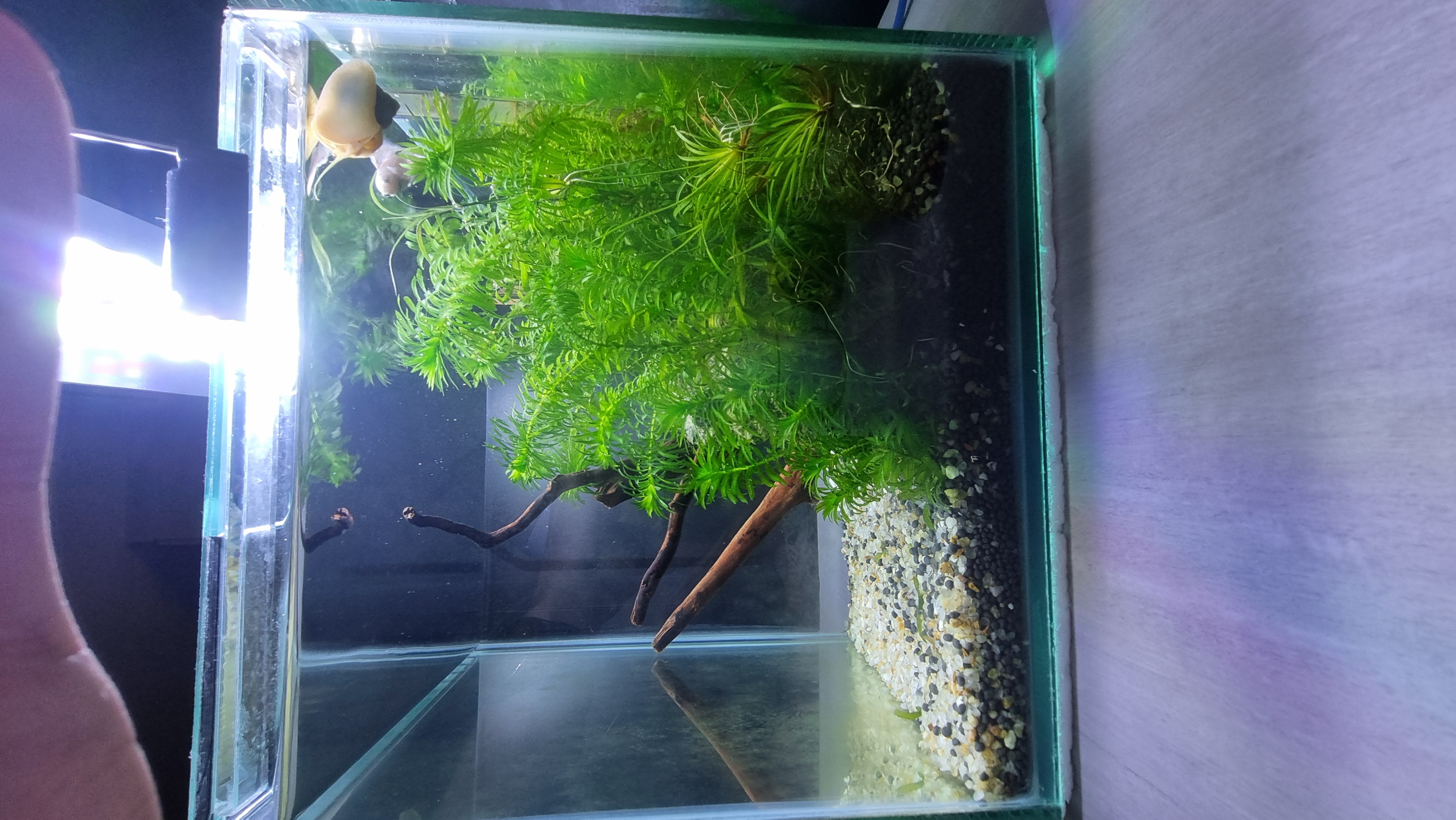 White Opal Male Betta, 2 yellow-common apple snails, 1 marble apple snail.