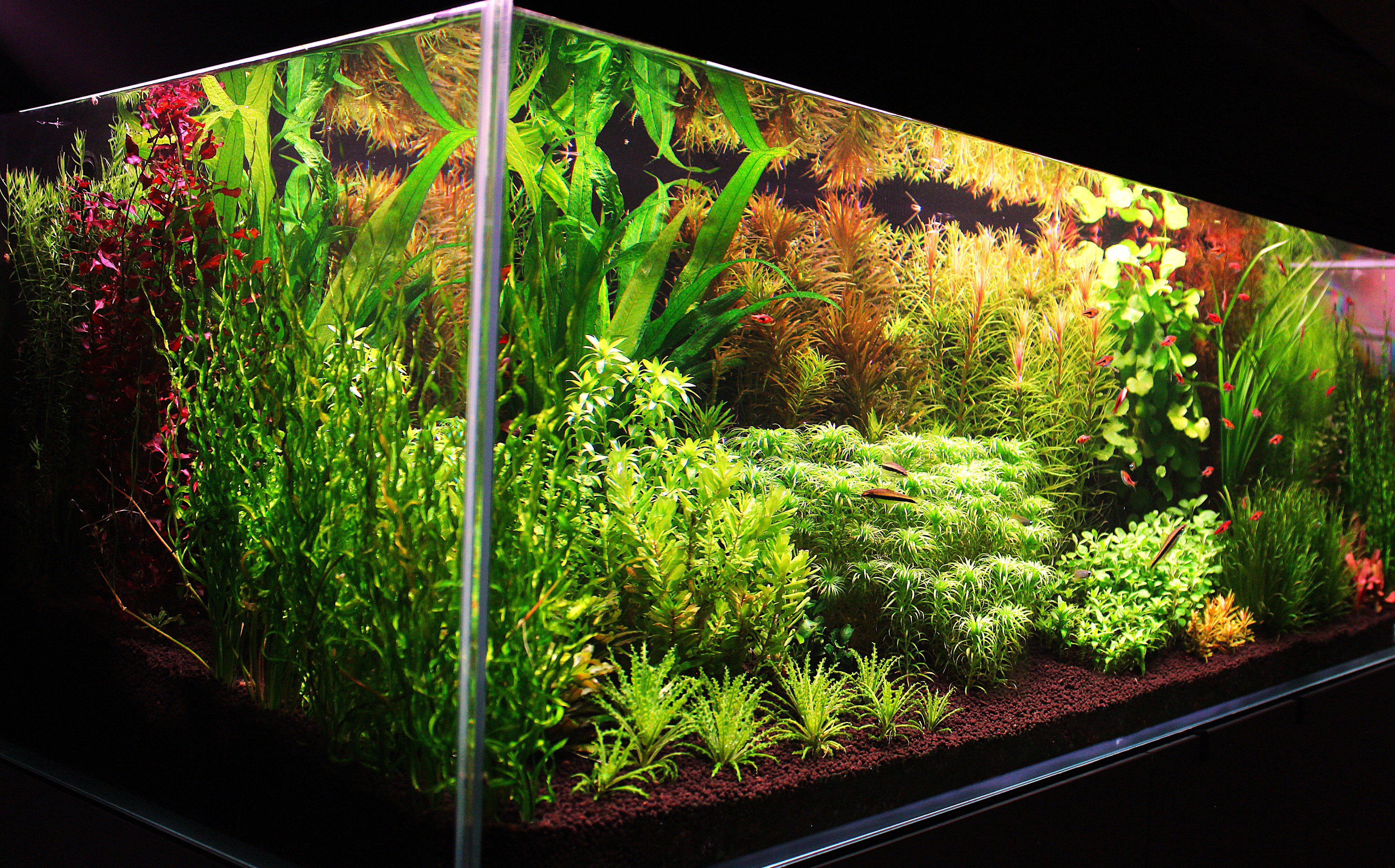 The dual Echonodorus Vesuvius on either ends along with two large grasses at the focal points create way too much symmetry. There is not enough contrast between plant groups. Many of the background plants seem to have the same height and similar leaf shape. The trimming and height variation of the Syngonanthus creates a highly atficial effect. Remove stunted Ammannia from the front - few manage to grow this plant under EI conditions. Five or 6 fewer species would have helped this tank.