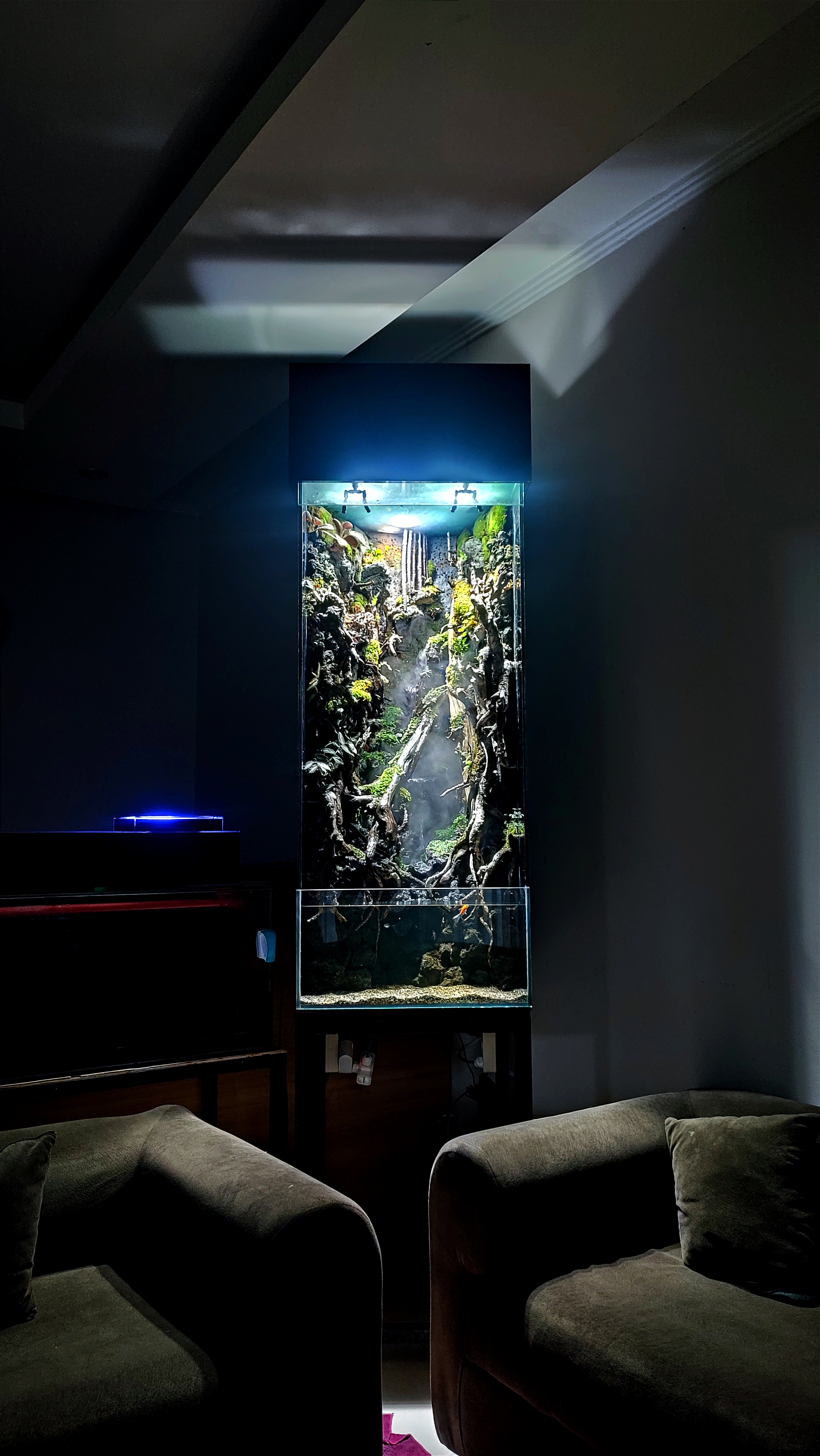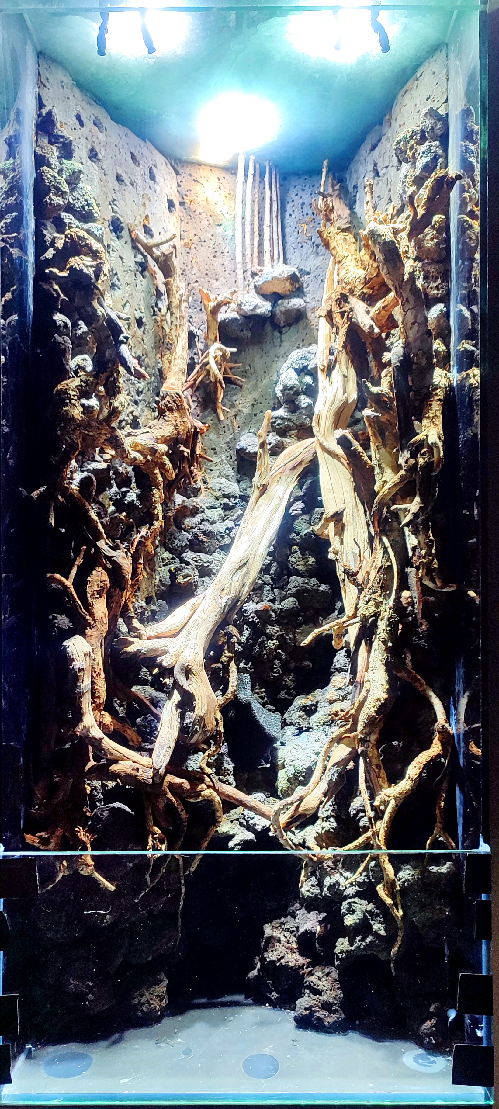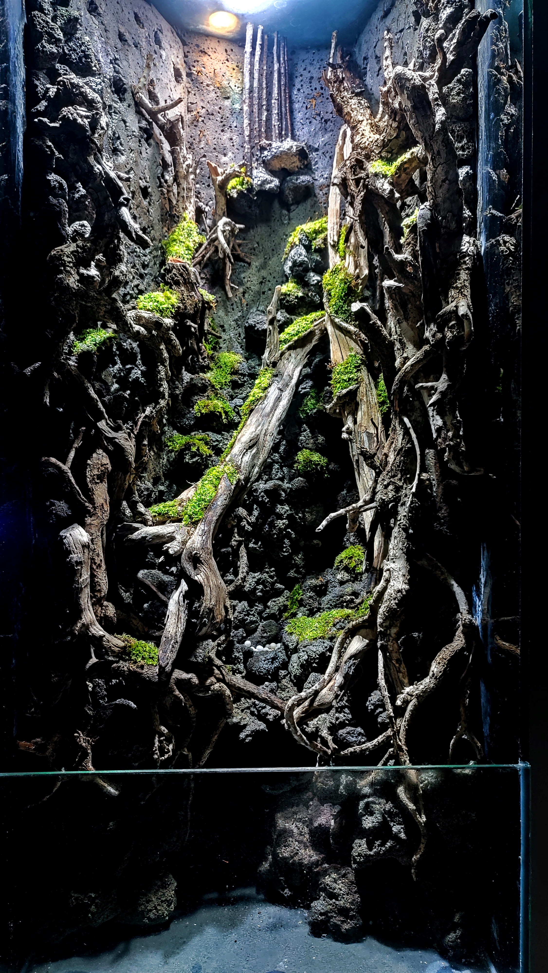 This is an impressively tall display! The hardscape elements in this paludarium help to draw the eye up high, as there is little to appreciate in the transition from life above to below the surface. This is disappointing, as the hardscape above the surface does so much of the visual heavy lifting. There are beautiful moments in this layout, but also are others that are confusing and break visual immersion. The main branches, cascading together, covered in moss create a fantastic impression. Right above them, a row of vertical twigs creates confusion against a flat wall. The planting is difficult to fully appreciate from the documentation, but appears to be great. The livestock feels less considered and rather inappropriate for long-term care.
