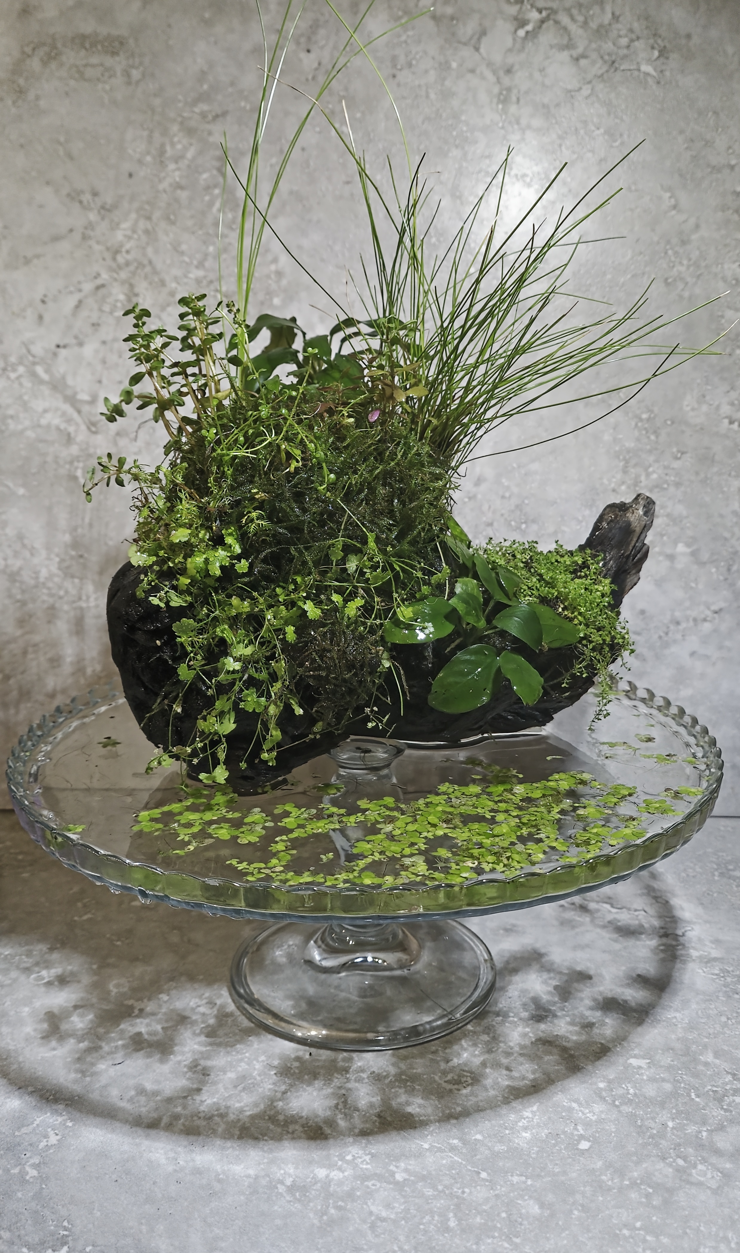 I like the hairgrass growing up and almost becoming part of the hardscape. The hydrocotyl on the wood looks a little wilted or at least not adapated to the emersed situation. I would have chosen a different vase that was deeper as I am not sure the vase pedestal adds to the look.