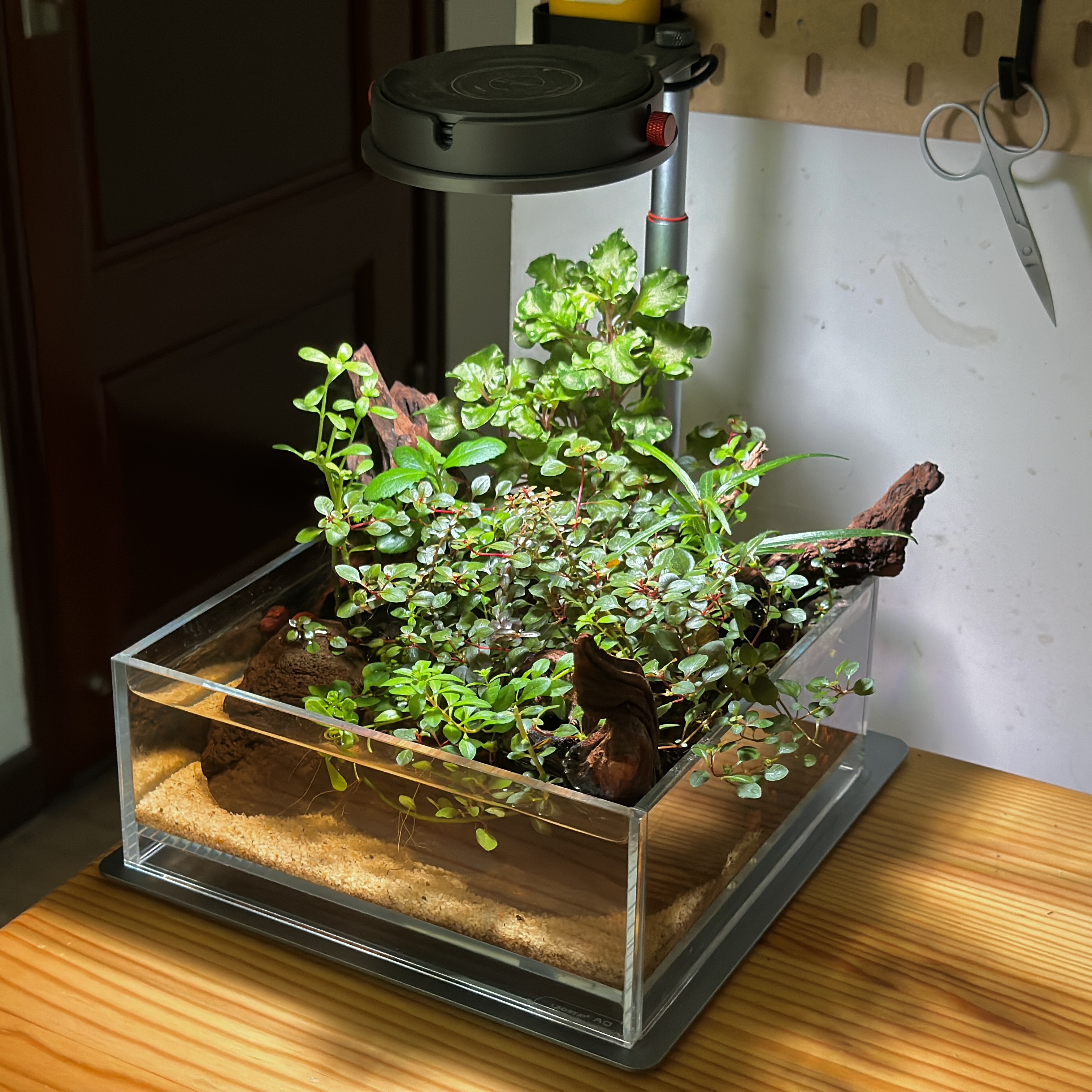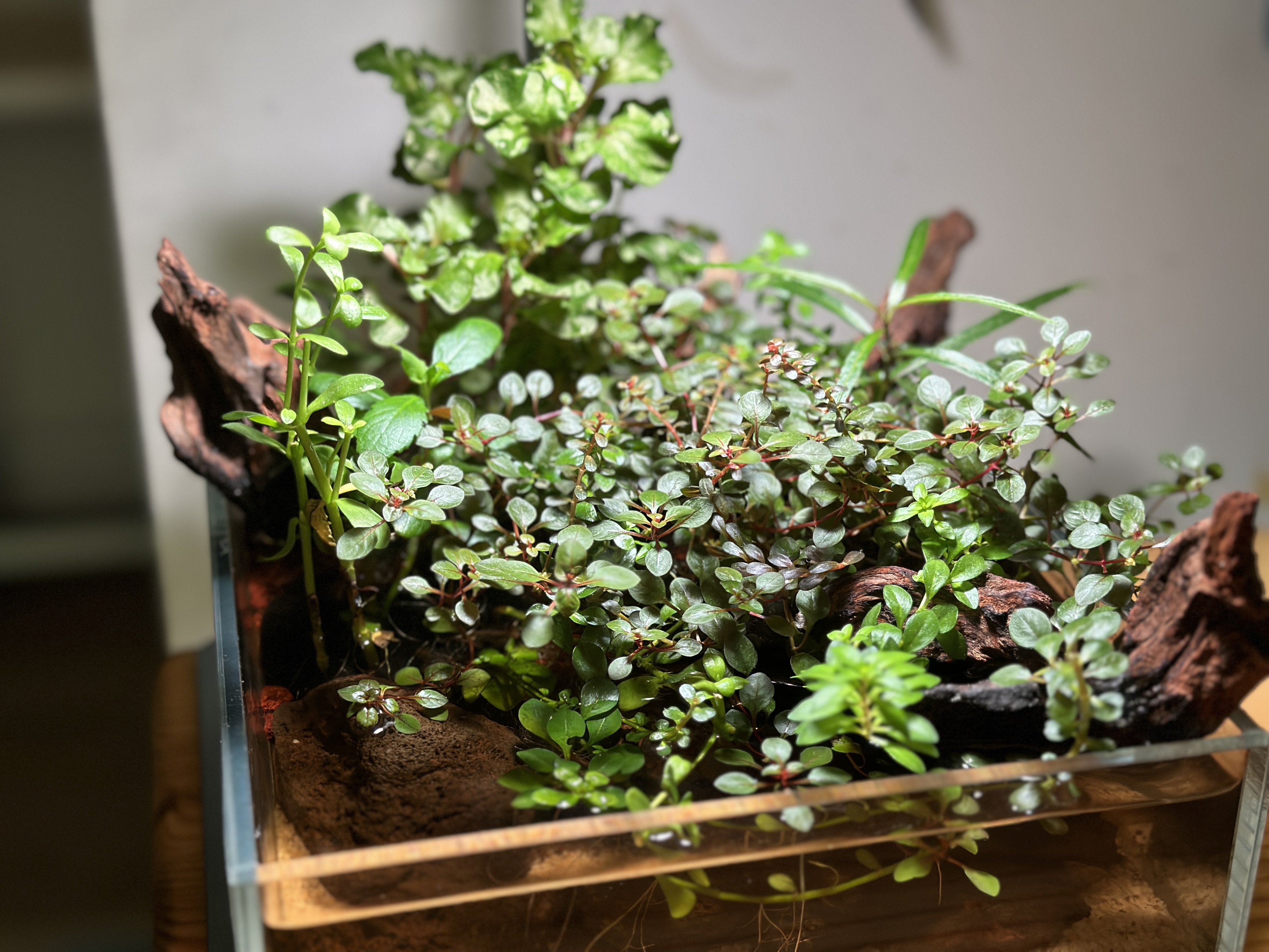 Nice and healthy plants that are well displayed on the wood. The trailing Ludwigia works well in the riparium. Better development of the aquatic section would really add to this aquascape. Good job!
