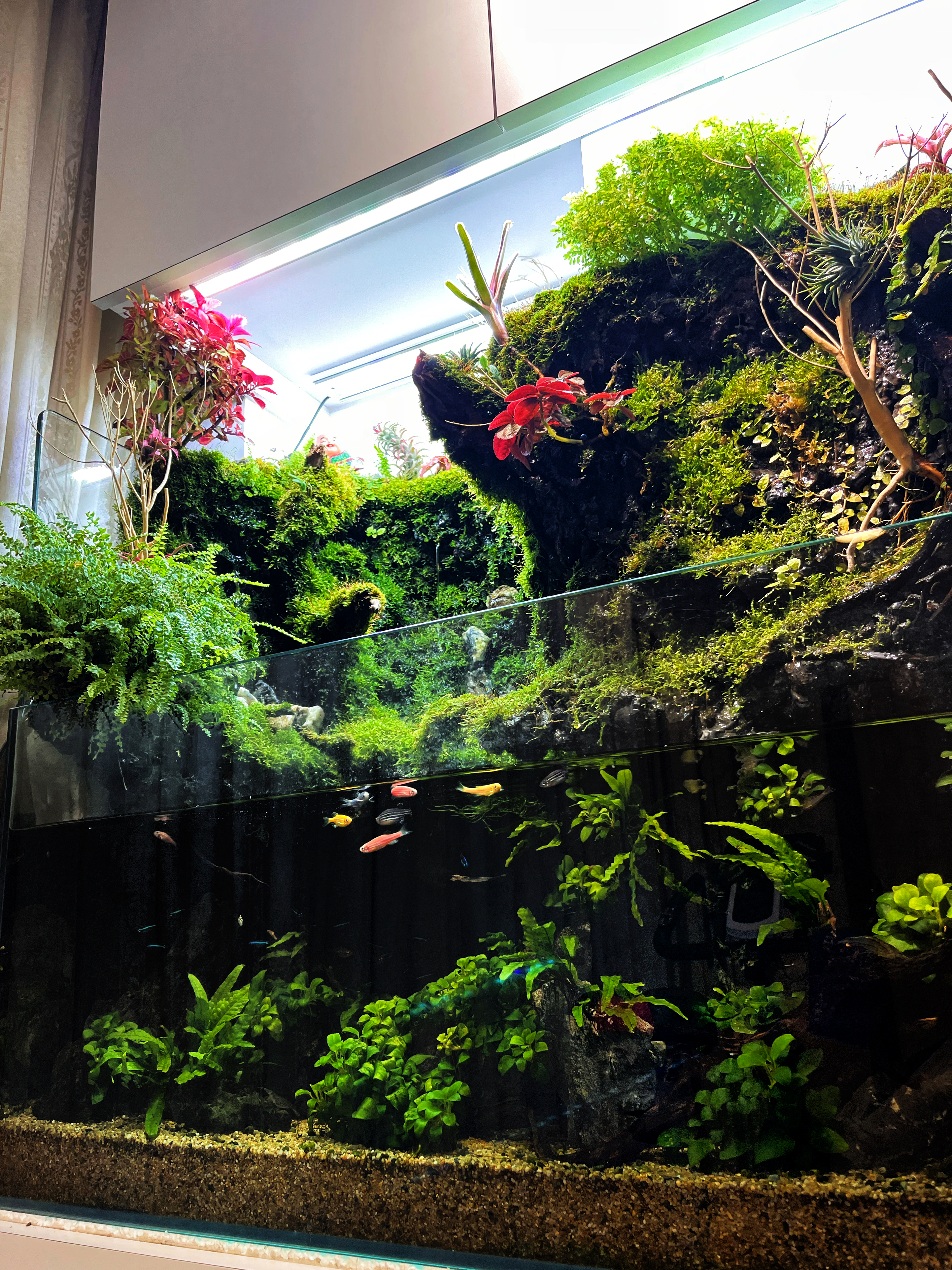 There are some beautiful elements to this display, though, many lack full integration to create a cohesive display. One could argue there are too many seperate elements competing for attention above the surface. This is not true below the surface, as planting is unified, giving a strong sense of completeness. Lighter pieces of wood above the surface stand out in contrast to the darker ones, drawing attention to yellowing foliage in the upper right two thirds of the composition. The presence of visible spray foam in the upper right corner also challenges the creator's attention to detail. The choice of livestock compliments the plant choice above the surface in color only, not in theme. With effort committed to culling the various independent elements, this would become a fantastically impactful paludarium.
