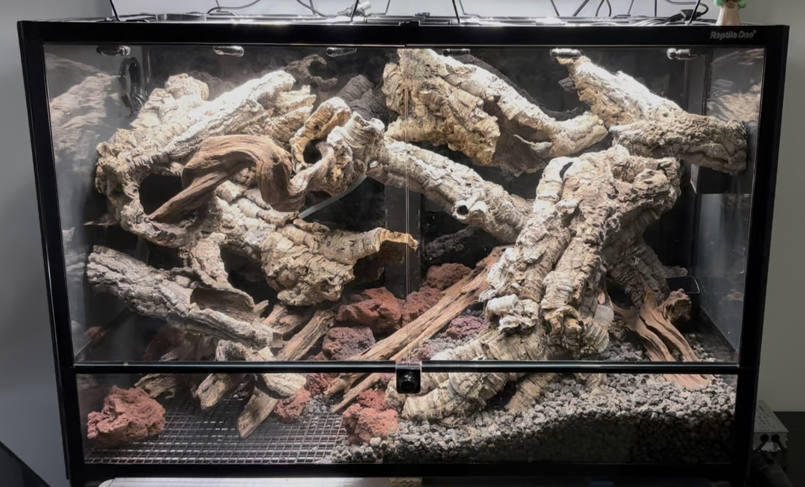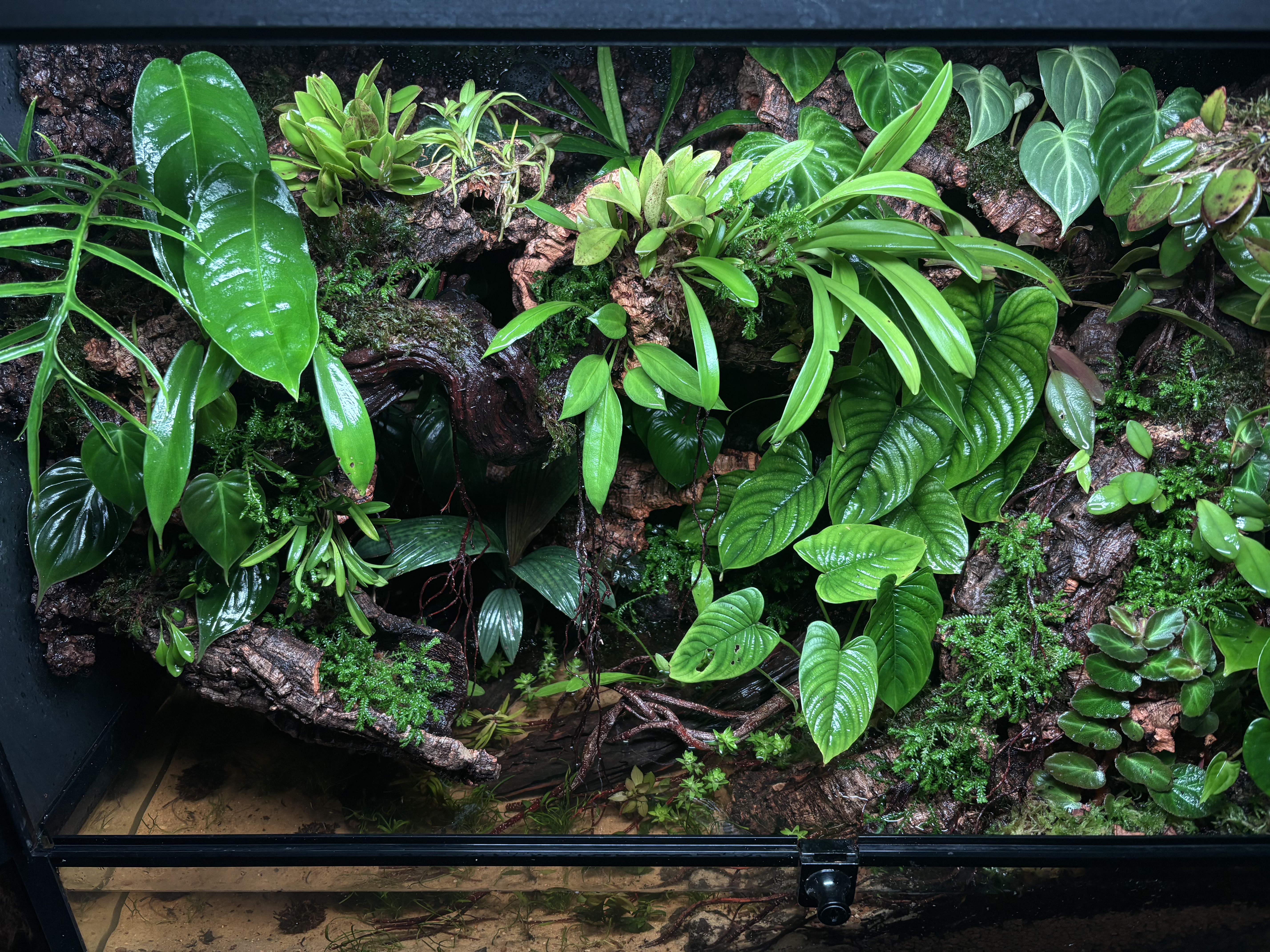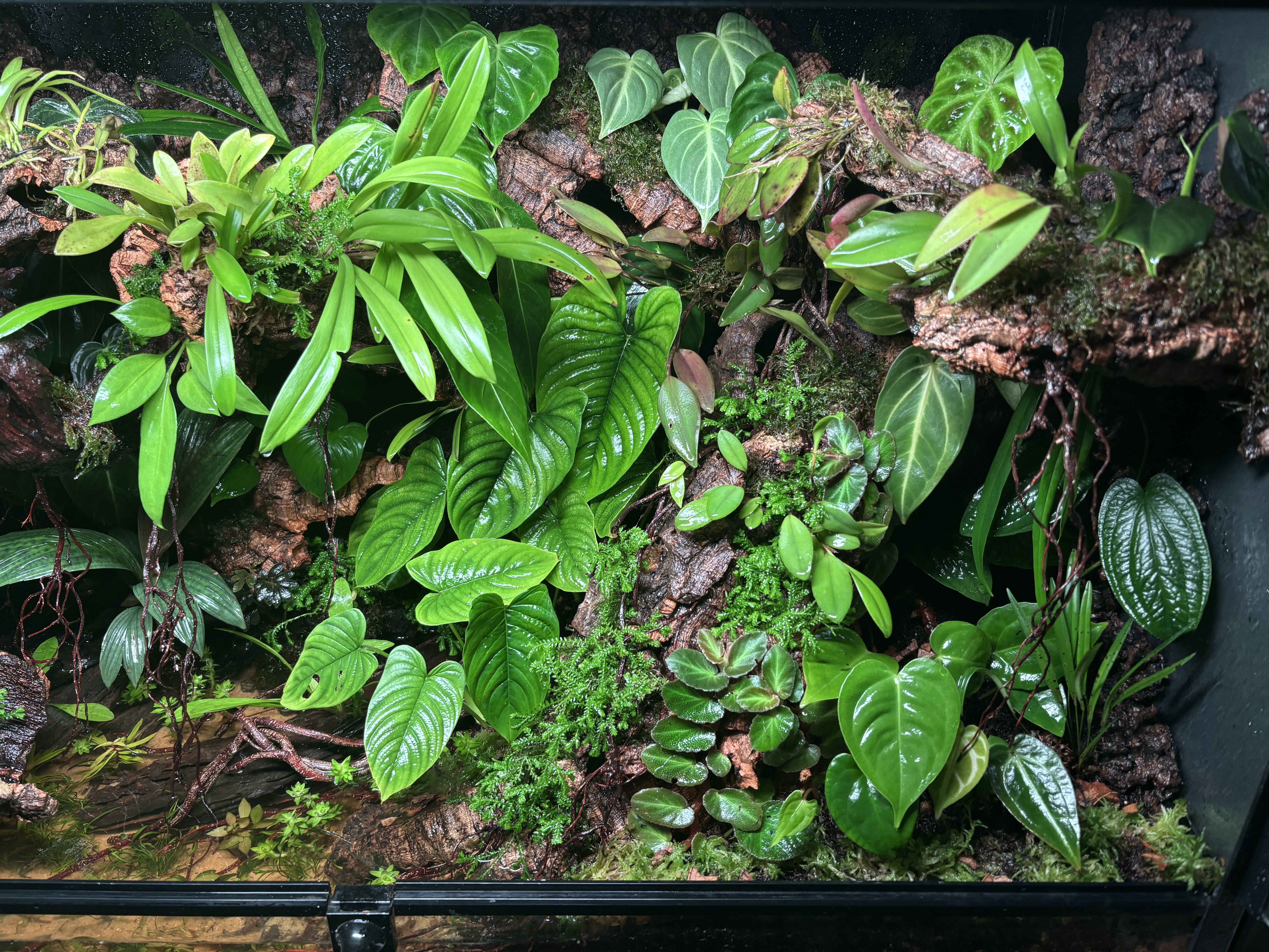 This is beautiful paludarium that immediately provides a rich, jungle-derived impact. Boldly-presented plants make this display stand out, whilst minor details in twigs that follow from the top of the layout - down to the very bottom into the water, keep the eye wandering across the composition. Needless to say, the layout has a clear transition from above to below the water . It is wonderful to see enough attention paid to the submerged portion. Discounting minor foliage damage and a less than ideal front-view substrate line, this is a fantastic submission with a unique choice of livestock. Great job!