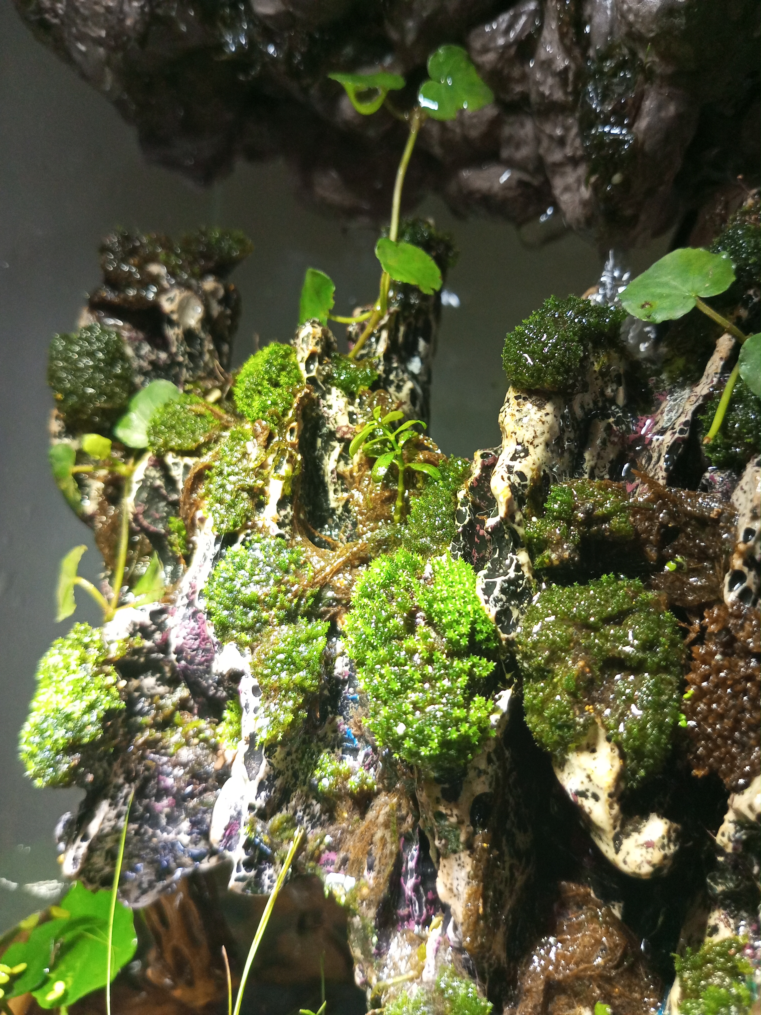 Many components of this paludarium lack integration to create a whole picture. There are many elements that are interesting, independently; however, when placed together, they feel unconsidered. Planting on the emergent portion is lacking in maturity and care, with foliage underdeveloped and not oriented towards the light. Below the surface, planting is even more sparse and lacking in integration. With more care, elements like wiring and overflow tubing could be concealed to enhance a sense of immersion.