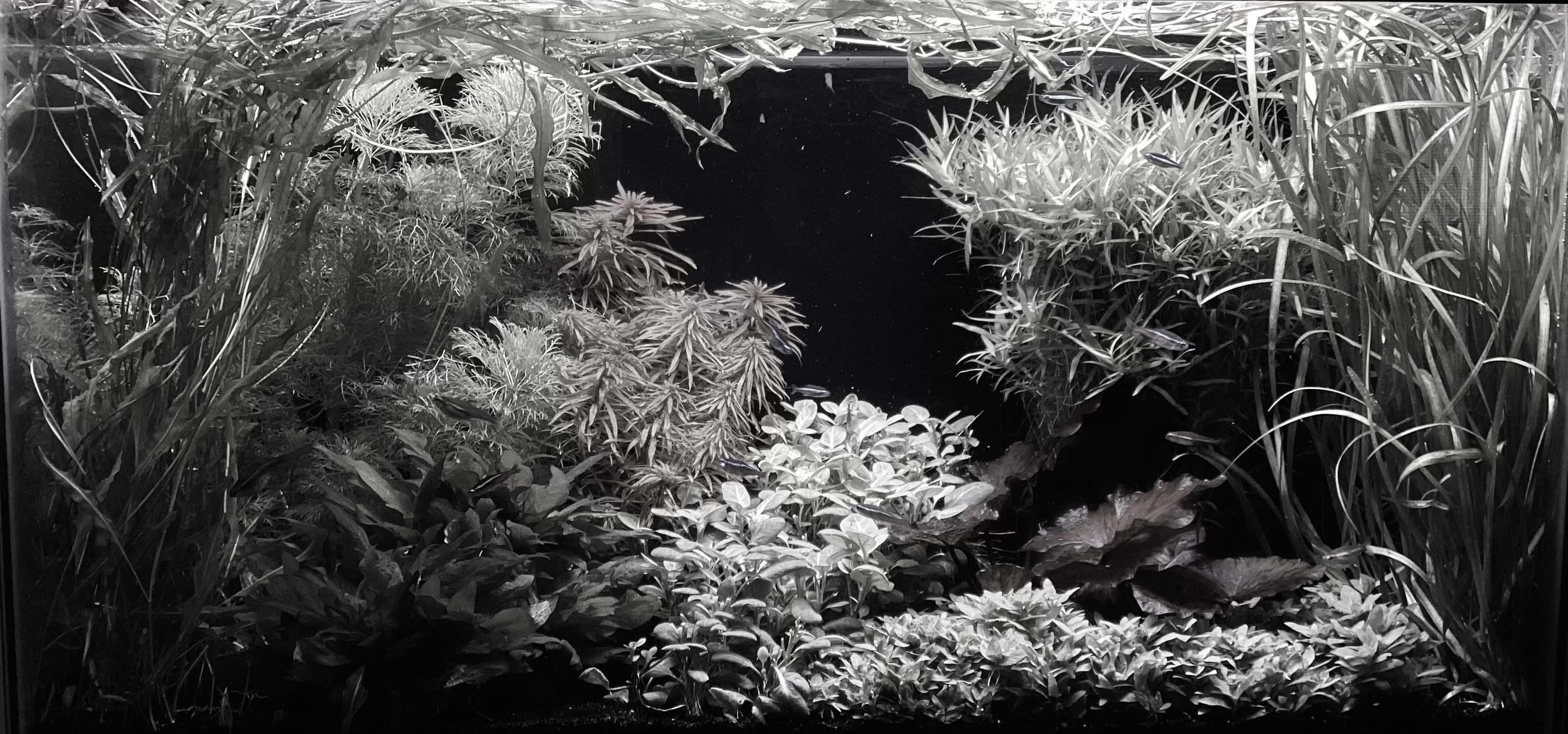 Nice, bright aquarium. What's striking is that the view to the back wall clearly divides the aquarium into two parts. Potamogeton lucens is a somewhat cluttered plant and blends somewhat with the Vallisneria americana on the other side, which reinforces the cluttered effect. Furthermore, this plant somewhat disruptively obstructs the view of the Limnophila aquatica behind it. In my opinion, the Limnophila aquatica is also a bit yellowish, and also small. The Lobelia street should actually run from wide at the front to narrower at the back to enhance the sense of depth. Regarding the fish stock: The groups are on the small side. Hemigrammus erythrozonus is very similar to Paracheirodon innesi and could therefore be omitted, while a fish is missing at the surface. The aquarium does appear healthy. A record of fish numbers is missing.