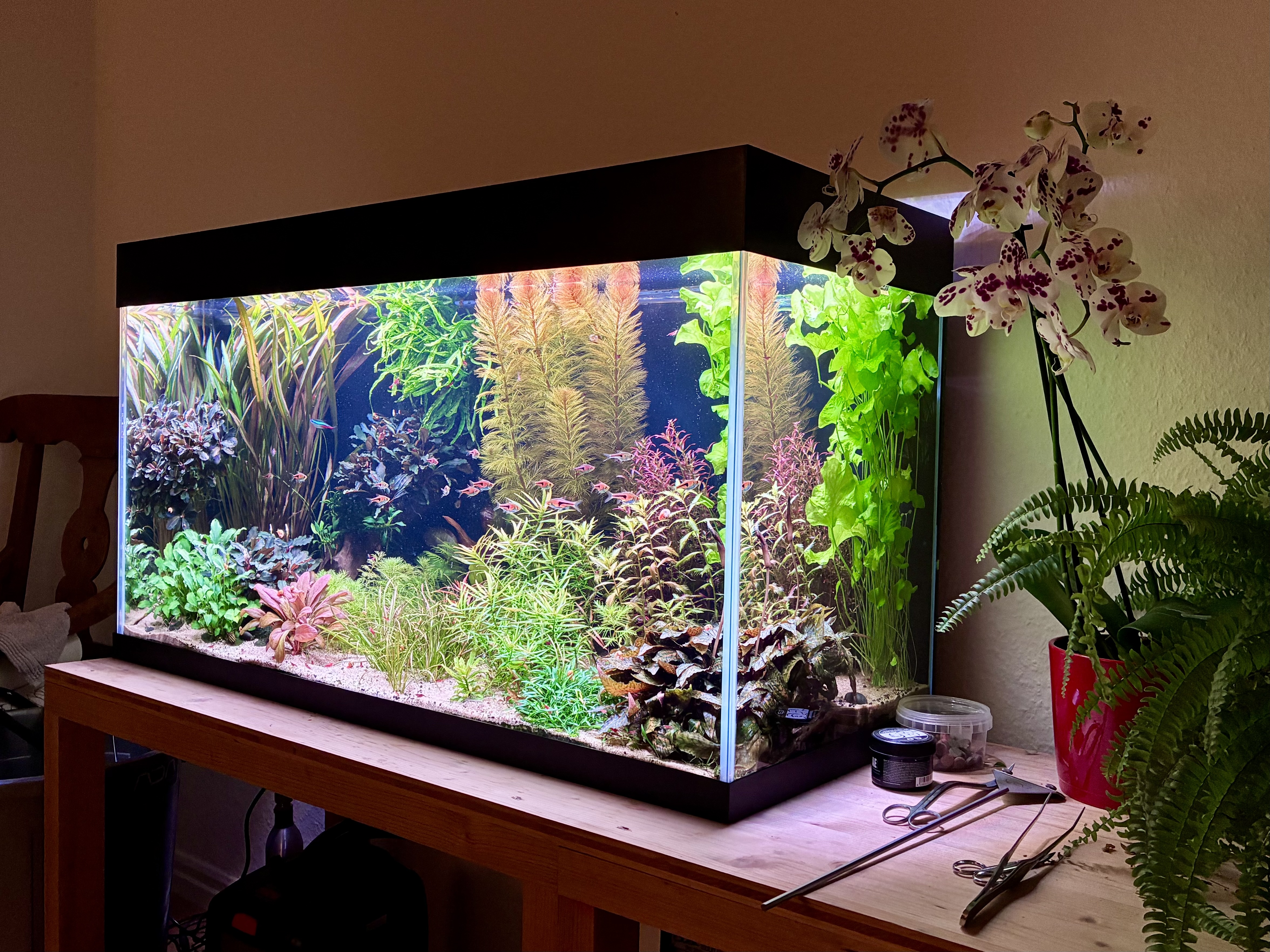 The aquarium looks good. A few comments: Myriophyllum mattogrossense should stay just below the surface. I count more plant species than listed. A plant map is missing. Some plant groups blend together. The small plant in the front right, which resembles Staurogyne repens, stands there lonely and abandoned and adds no value. The Rotala rotundifolia Singapore group could be a bit more robust. Surface-dwelling and bottom-dwelling fish are missing.