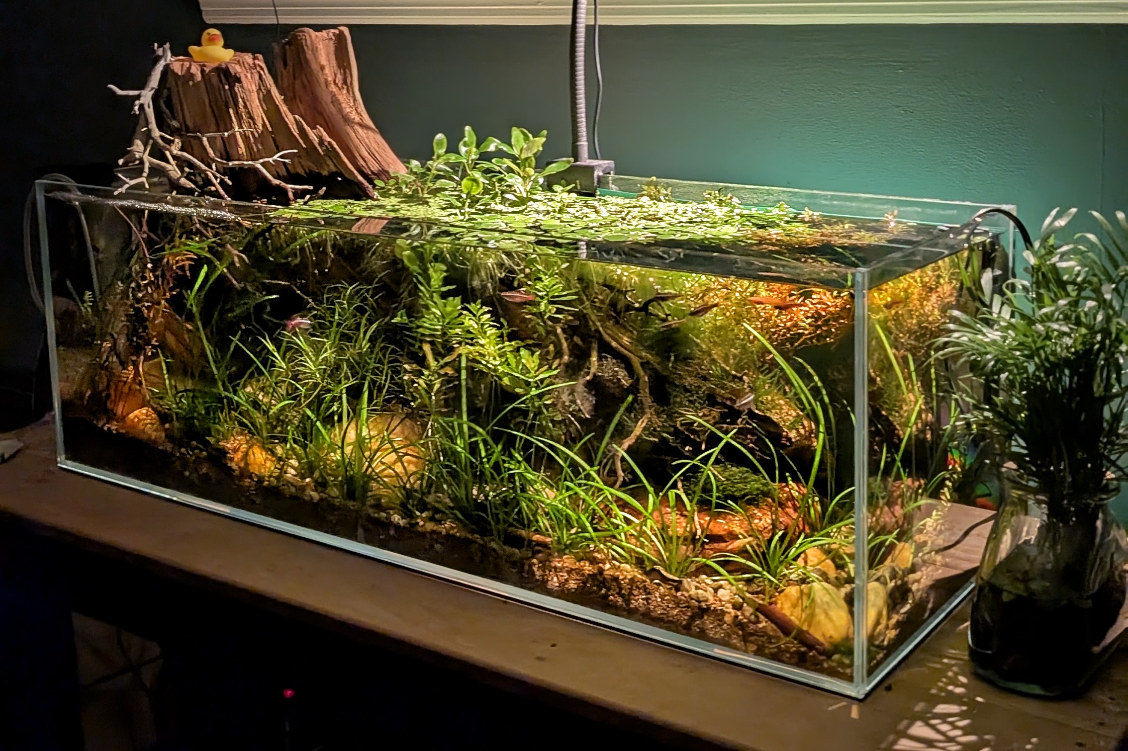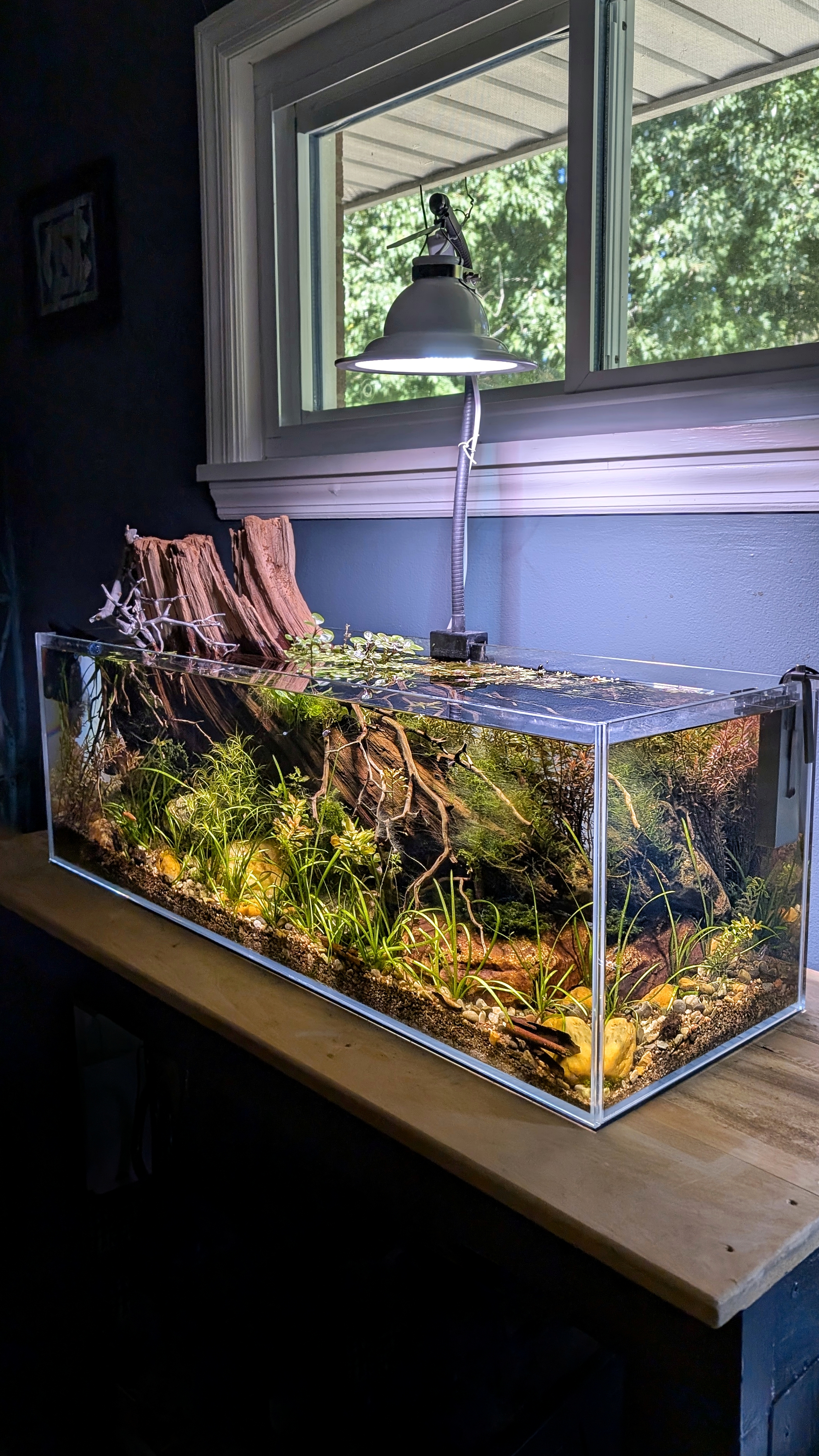 "The North Fork" Catawba River inspired mnature aquarium. 20 gallon long, no C02, mostly native plants. started this tank using only plants found in the Catawba River. There was a spot near Linville Falls that had red and purple plants everywhere. It had been untouched for 10+ years. It was full of Greenhead Shiners, Tessellated Darters, and Mountain Dace. After hurricane Helene this section of the North Fork was destroyed. The creeks were flattened and widened, the trees were ripped apart, and the flora and fauna were devastated. Luckily nature is resilient. From what I've seen this section has started to regenerate and the plants and fish are increasing in numbers.
