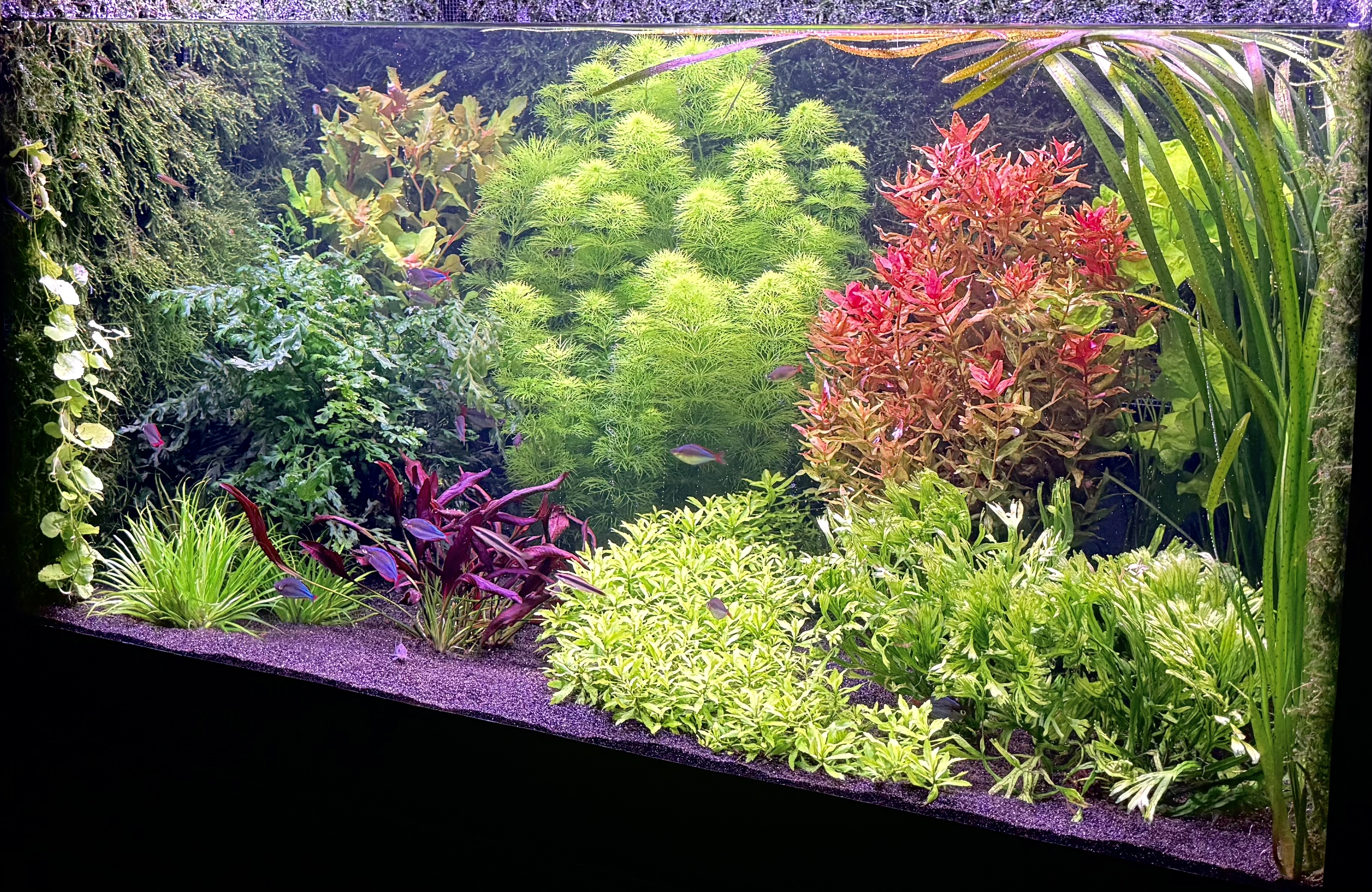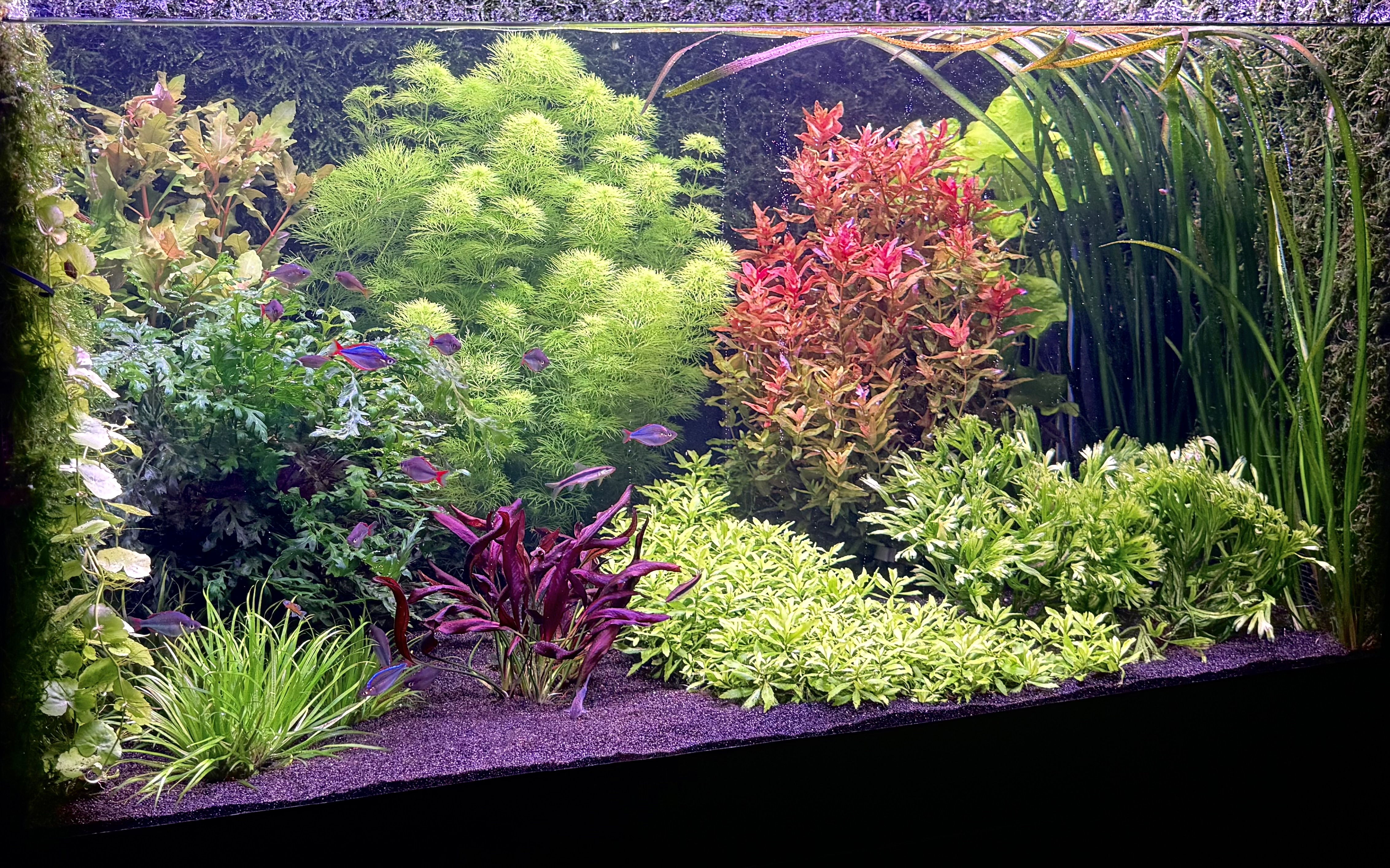 Technically speaking this is one of the best entries this year, if not the best. By that I mean things like placement, space between groups, a street that goes all the way back with a little back wall showing through, contrasts in colors and heights, moss on all three sides, solid focal point in the correct 1/3 spot, negative space in the foreground. This tank doesnt just check all the boxes, its an impressive demonstration of these fundamental core principals. There's some advanced techniques on display too. Like having the biggest Blyxa in front and smaller ones in back to create depth. A couple more plants wouldve really brought that look home The Purple Knight seems like a perfect plant for the focal point, and its in the right place. But its too small atm to really command the attn it needs to. Feels out of scale with the rest of it. The Bolbitis on the left isnt the best choice of plant for right there. A dark green or two always adds a nice effect, but right here being dark it blends in with the wall too much, and the other two greens also to some extent. The picture doesnt do it any favors however, Im sure it looks better in person One more small critique, I like your idea with the Narrow K. Personally think itd look better if it didnt follow the exact contour of the Lobelia street, and wasnt all the same height. More of a bush instead of a quasi-street. Also Ive never seen Narrow K leaves get that fat while staying so short. Not sure if you have those buried really deep or what, but its always best to leave Microsorum's rhizome exposed above the substrate Overall this is a really good Dutch tank. With just a few small tweaks itd be a great one!