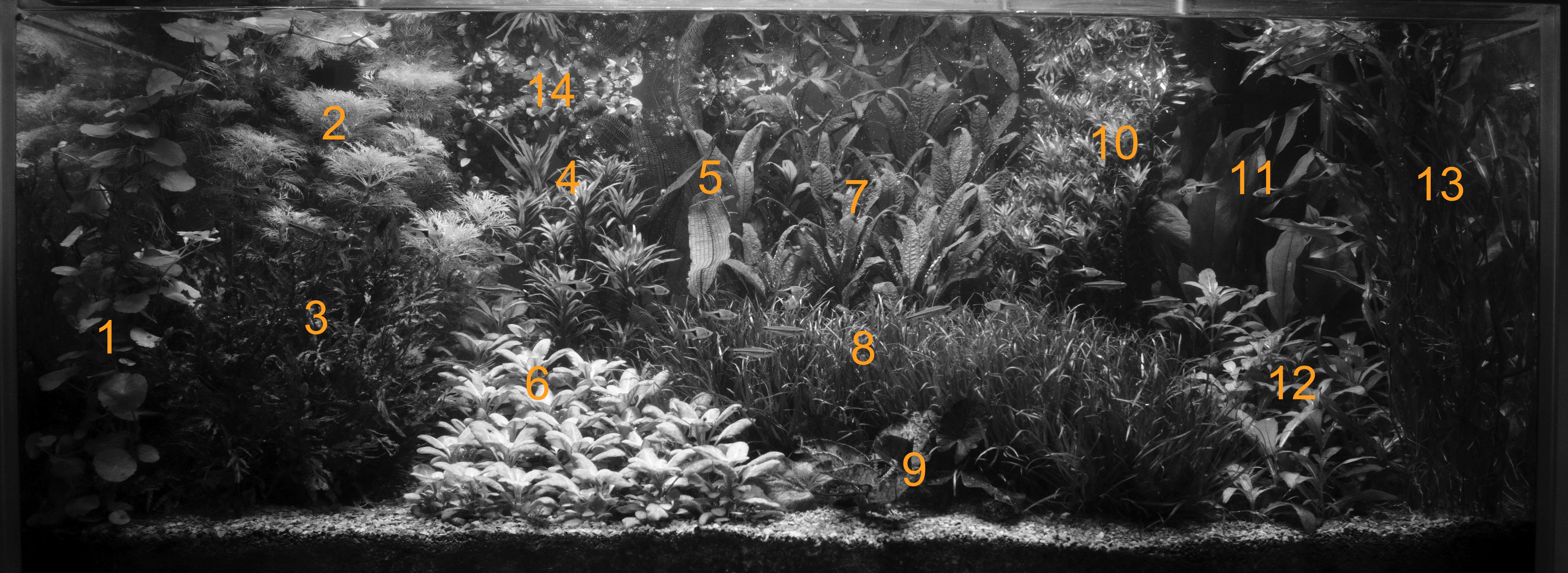 1 - Hydrocotyle Leucocephala 2 - Liminophila Aquatica 3 - Bolbitis Heudelotii 4 - Pogostemon Kimberly 5 - Aponogeton Madagascariensis 6 - Lobelia Cardinalis “mini” 7 - Hygrophila Corymbosa 'Siamensis' 8 - Blyxa Japonica 9 - Nymphaea Zenkeri 10 - Rotala Rotundifolia “Blood red SG” 11 - Echinodorus Bleheri 12 - Staurogyne Spatulata 13 - Potamogeton Lucens 14 - Anubias Petite “White”