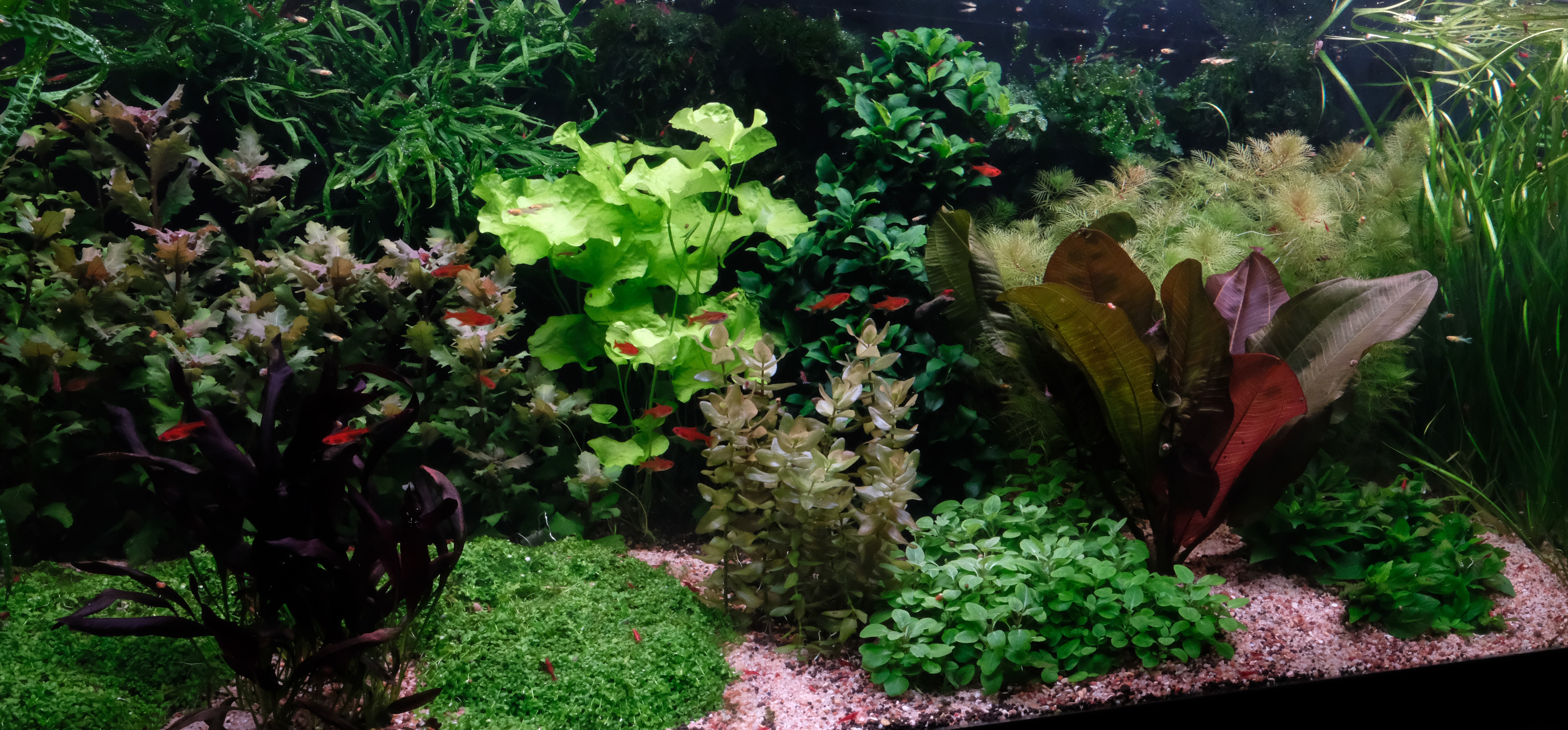 This tank has rough and brooding feel to it with almost all the plants looking bold and stoic. It lacks warmth and softness. The symmetry of the four lumps of equal-sized and equidistant foreground plants is unpleasant...and the grasses on either ends adds to the symmetry.