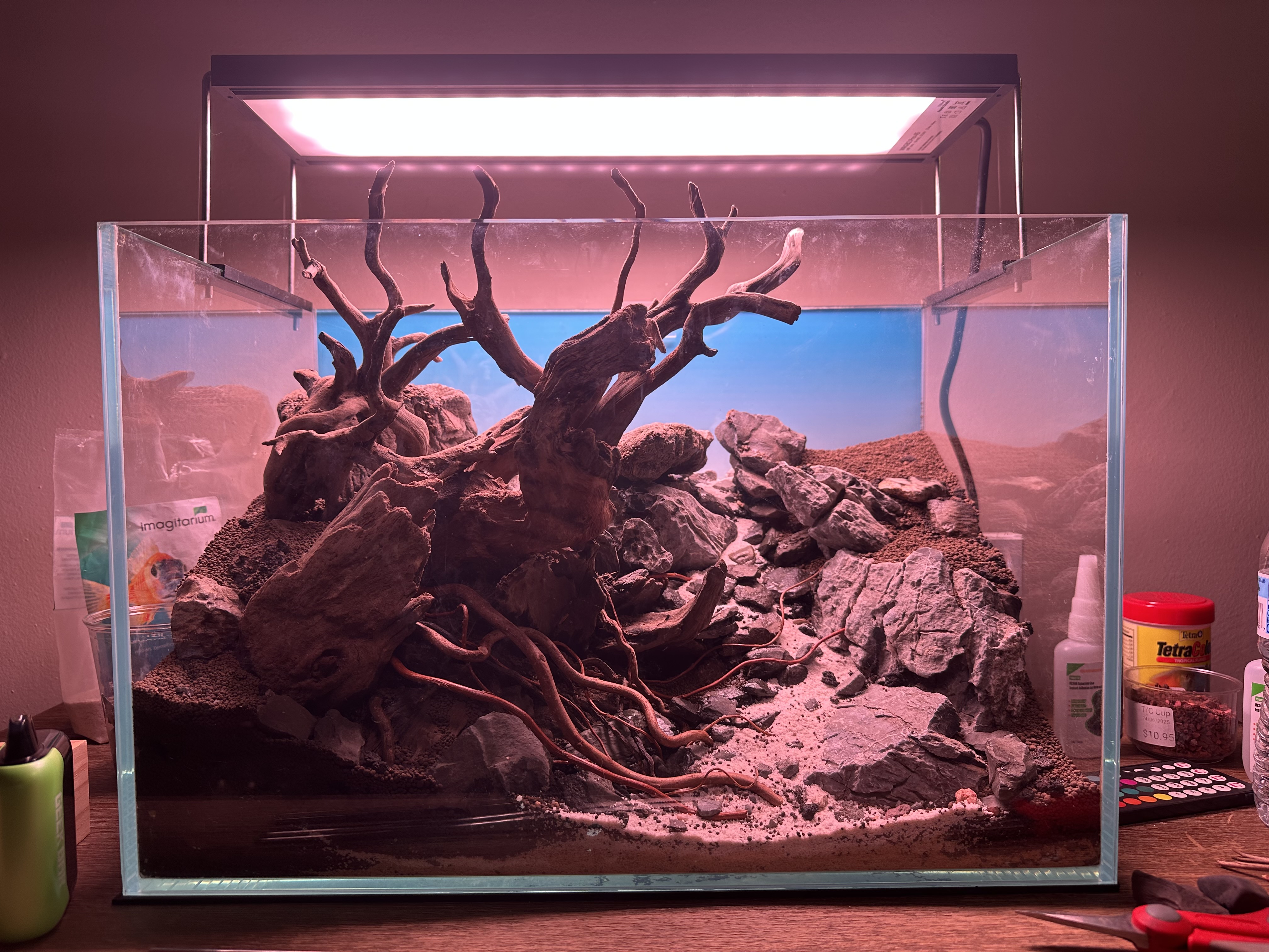 Left and right side of this layout are from 2 different worlds, i do not see any connection either side of the path. try to connect and create some balance between the left and right side, this is a general and important rule to any aquascape.